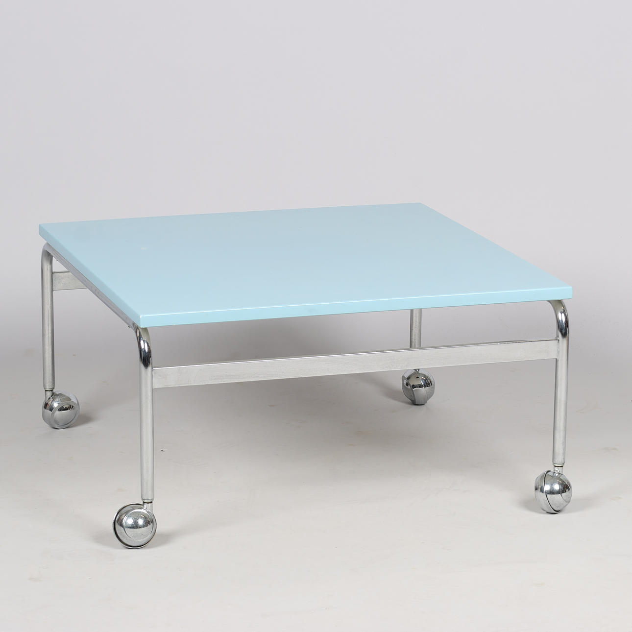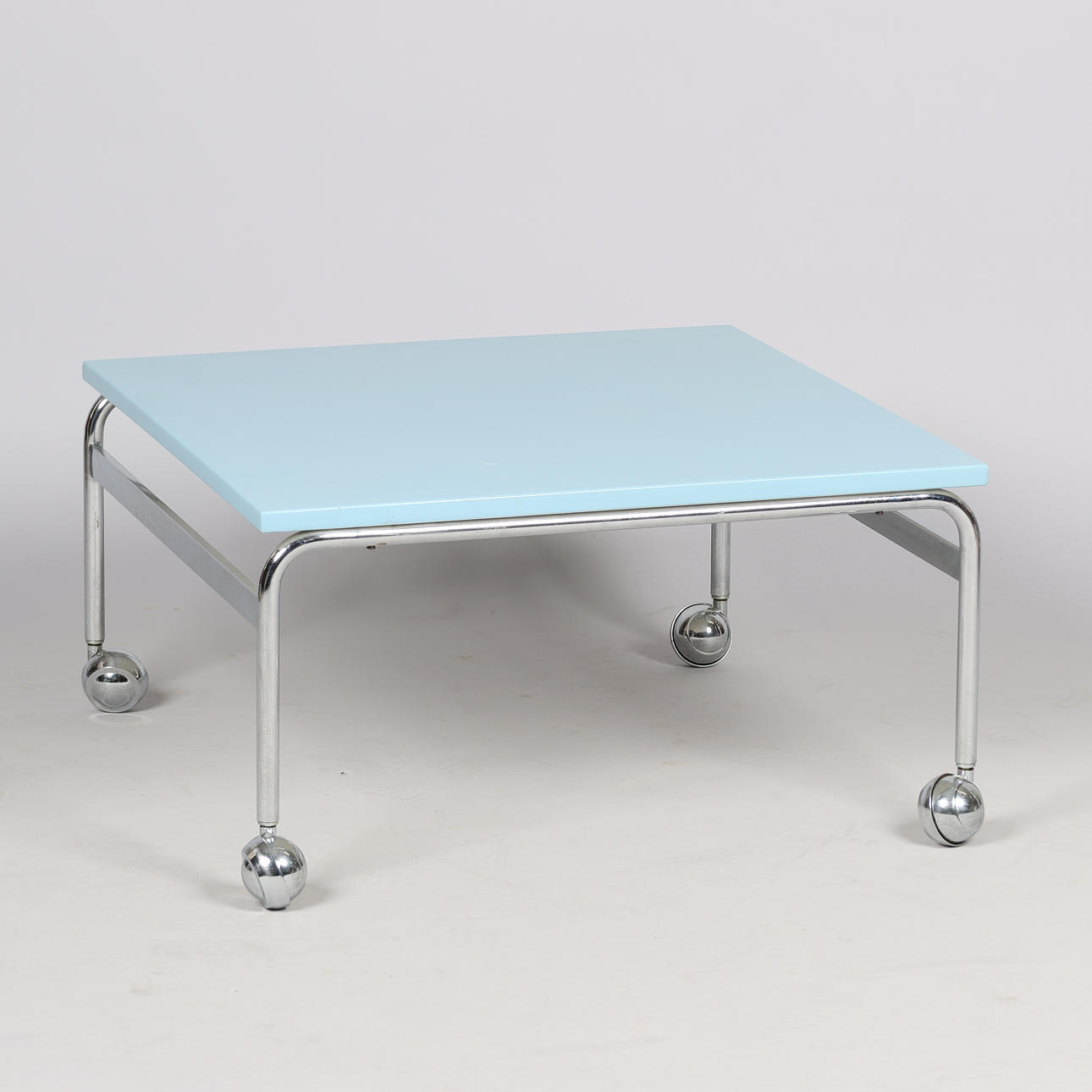 4359790. BRUNO MATHSSON. Couchtisch „Karin“ mit hellblauer Tischplatte und verchromtem Gestell auf Rädern, DUX, Schweden, zweite Hälfte des 20. Jahrhunderts.