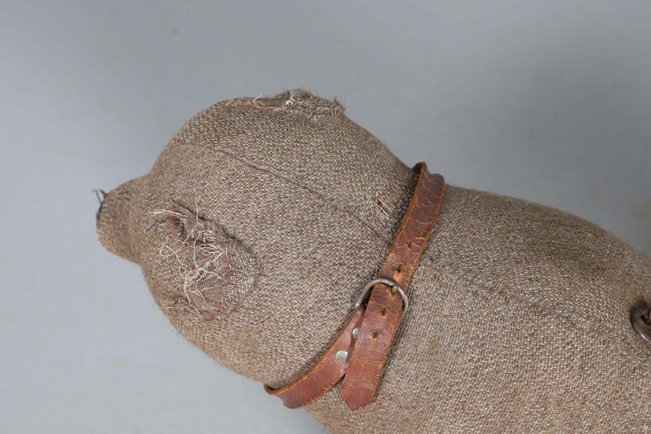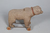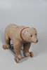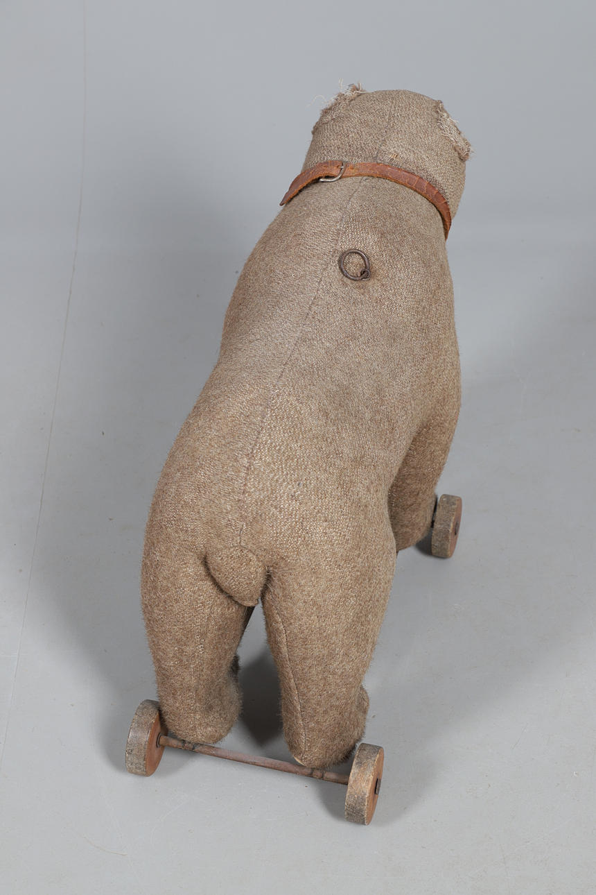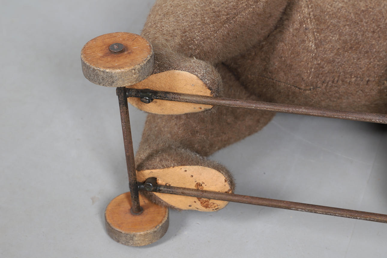 Wahrscheinlich von Steiff, einem Teddybär aus dem frühen 20. Jahrhundert, mit schwarzen Stiefelknopfaugen und genähter Nase und mit einem über eine Zugschnur betätigten Knurrmechanismus (funktioniert nicht), mit Eisenrahmen und Holzrädern. Unmarkiert, ca. 58 cm lang, 42 cm hoch.