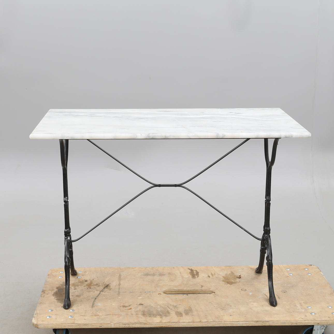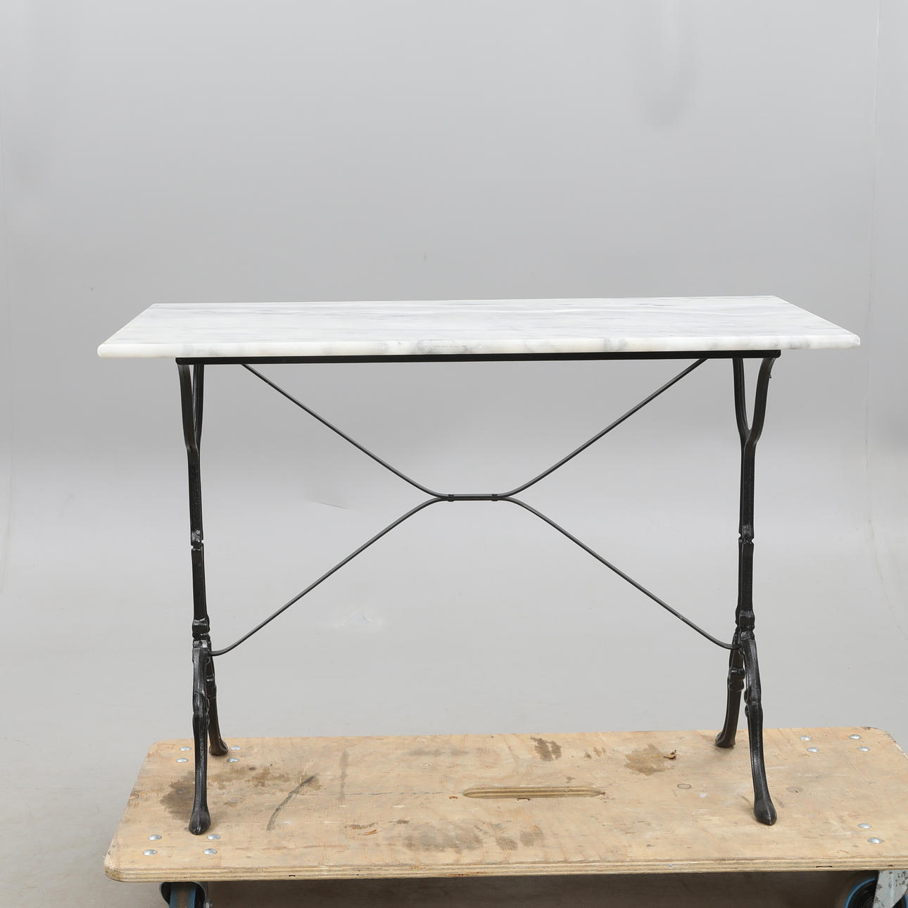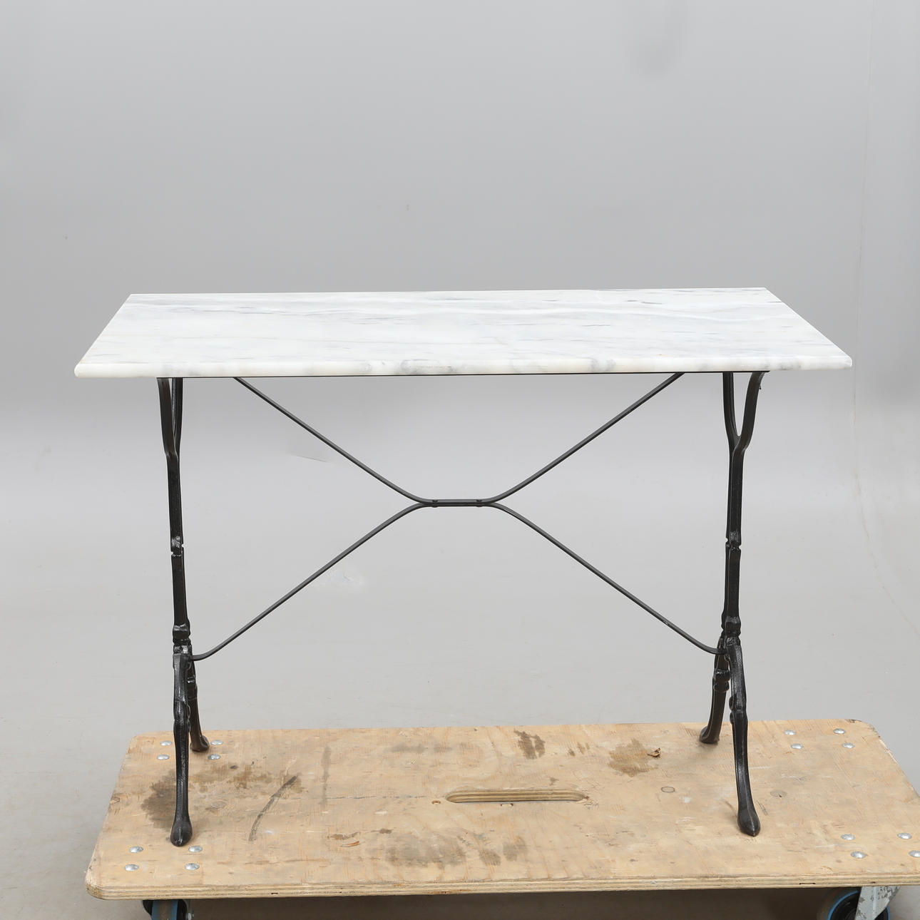 GARTENTISCH, Standfuß aus Gusseisen mit Marmorplatte.