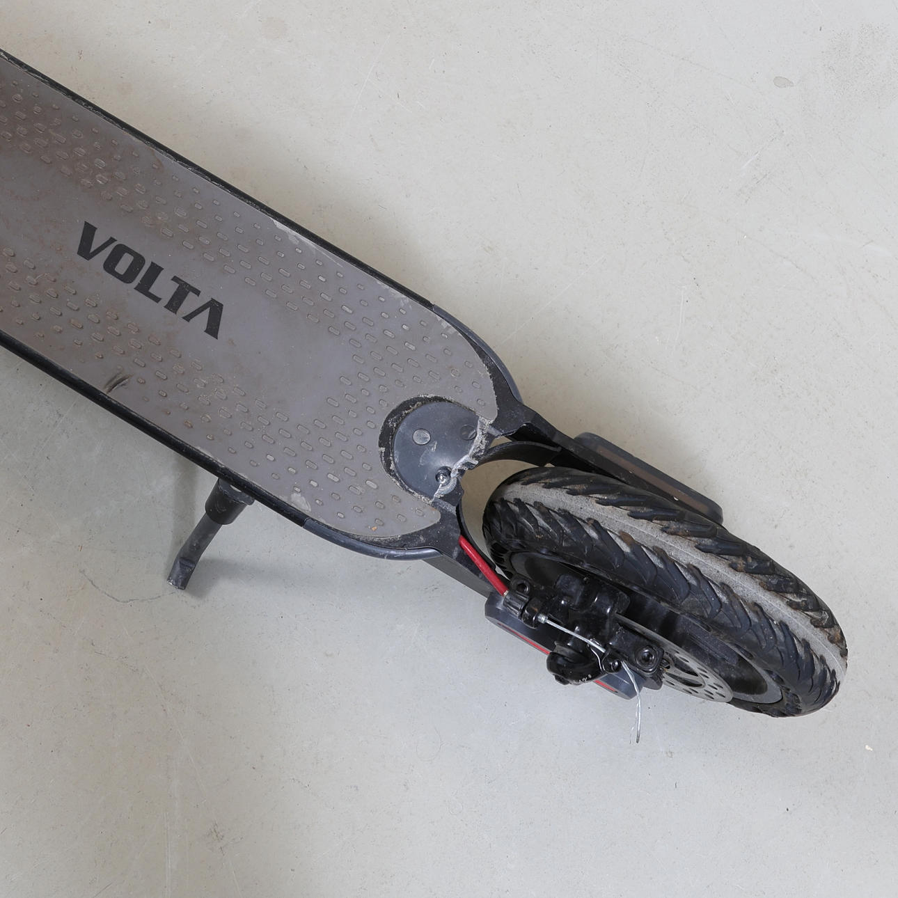 Am Standbrett fehlt eine kaputte Bremse/ein Kotflügel. Am einklappbaren Lenker ragt eine Feder heraus.