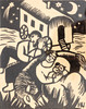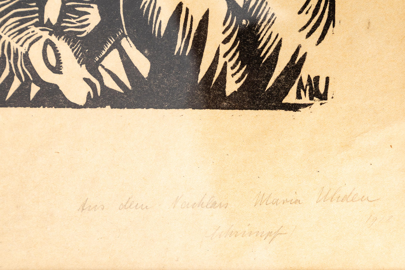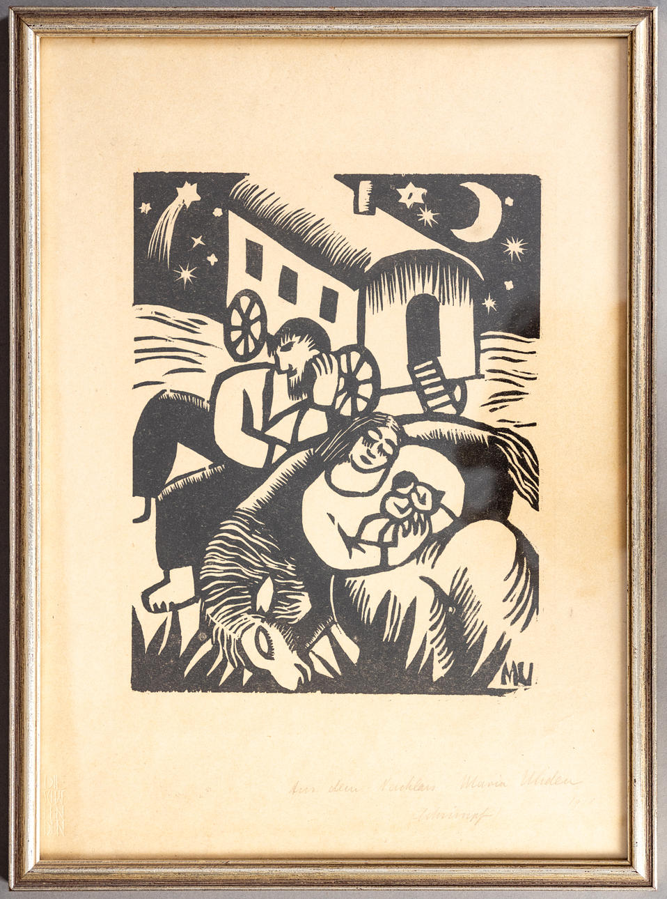 Maria Uhden (1892-1918), Zigeuner, Holzschnitt aus der Mappe "Die Schaffenden", 1918, 1. Jahrgang, 3. Mappe, im Stock monogrammiert, signiert "Schrimpf" sowie bezeichnet "Aus dem Nachlass Maria Uhden 1918", links unten mit dem Trockenstempel "Die Schaffenden", aus einer Auflage von 125 Exemplaren, ca. 25 x 20 cm, hinter Glas gerahmt, mit Rahmen ca. 43 x 32 cm.
