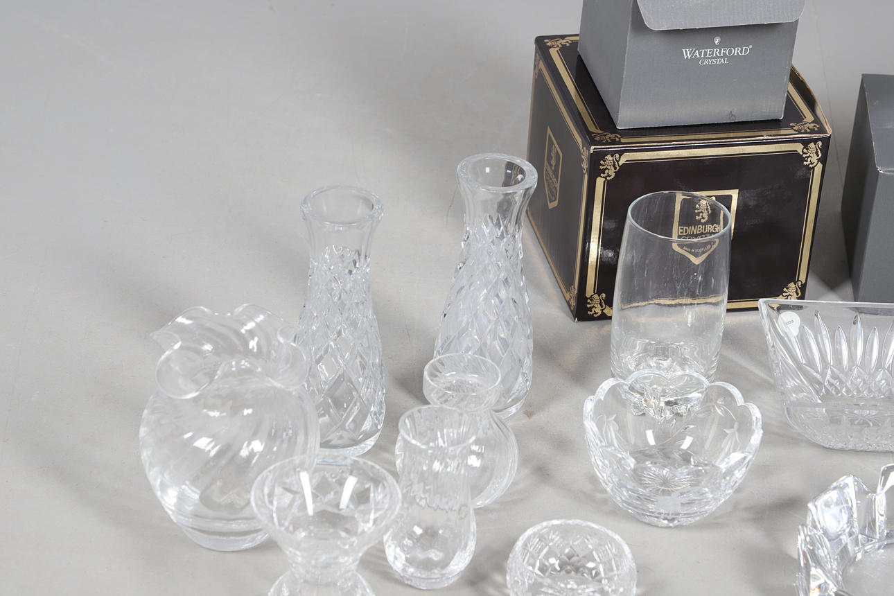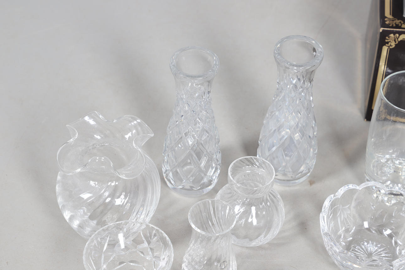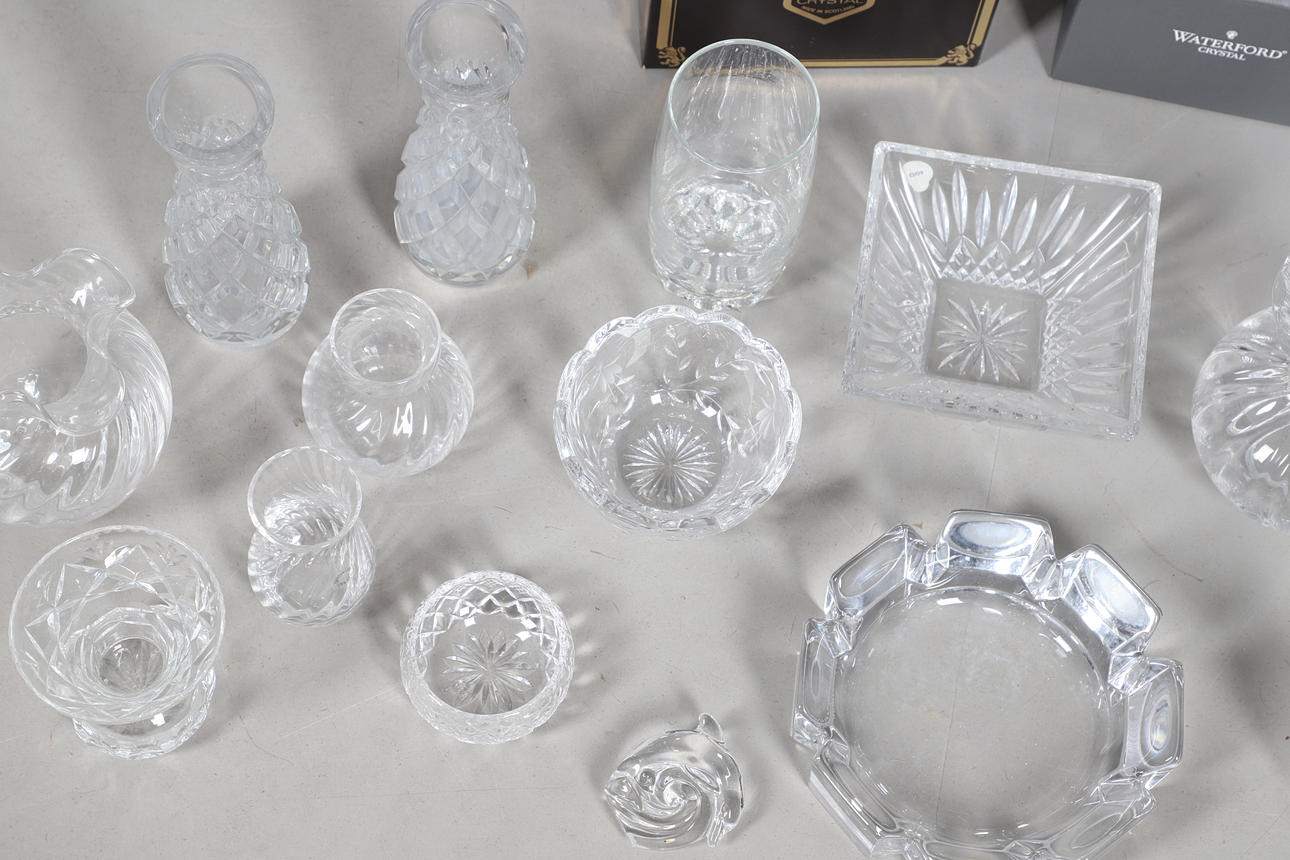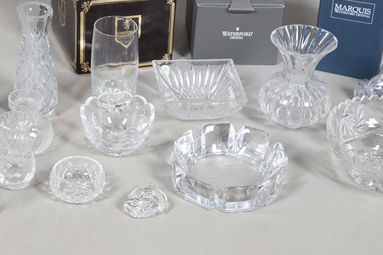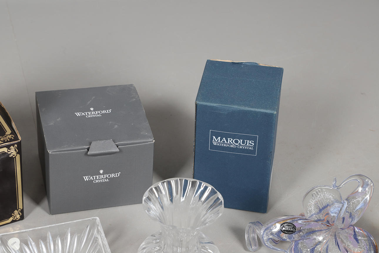 einschließlich eines Aschenbechers aus Orrefors-Glas, 18,5 cm Durchmesser, einer Orrefors-Glasvase mit gezackter Randform, 15 cm hoch, einer gedrehten Stängelblume aus Muranoglas, einem Paar geschliffener Glasvasen, 20 cm hoch, Waterford Crystal Nachttischleuhr, Waterford Crystal Topf und Deckel usw., einige mit Originalkartons.