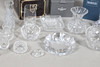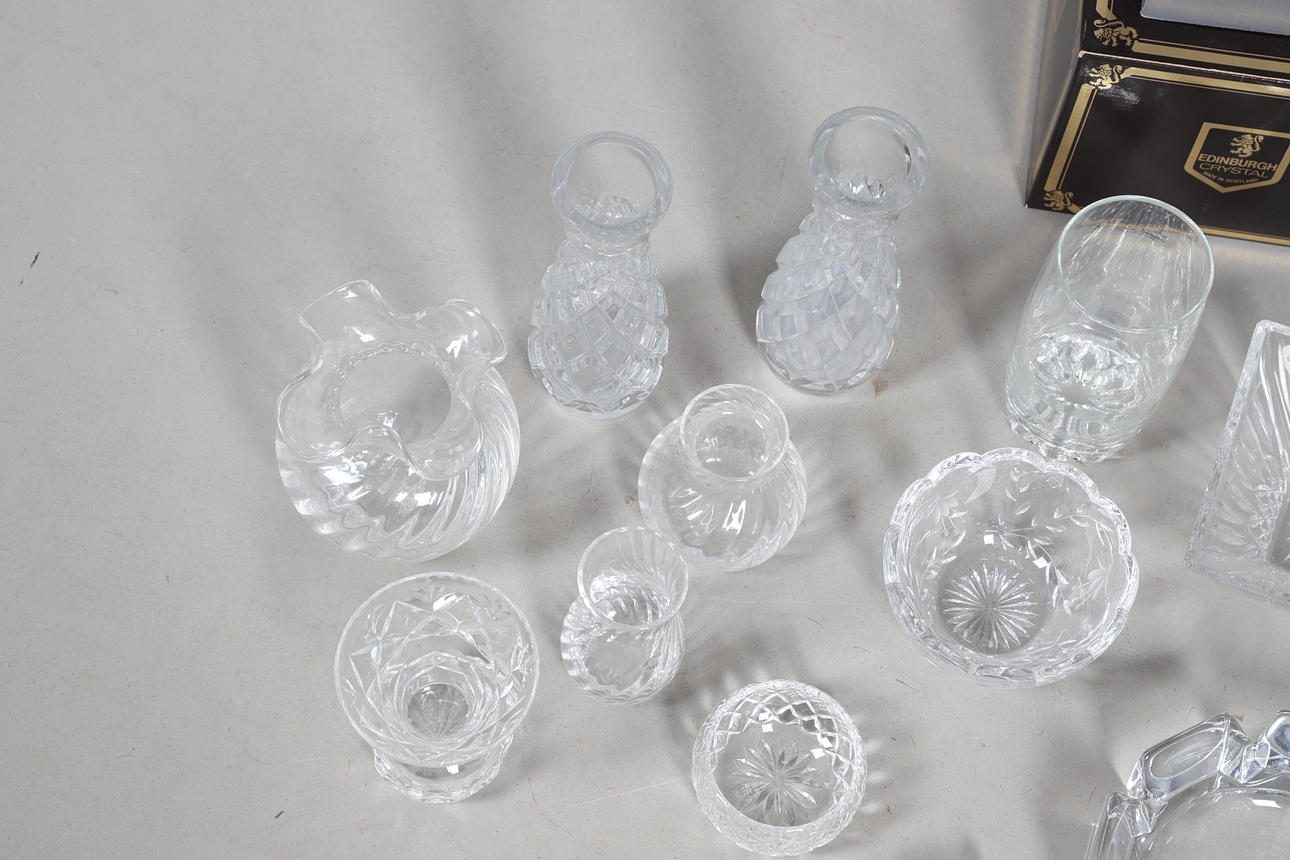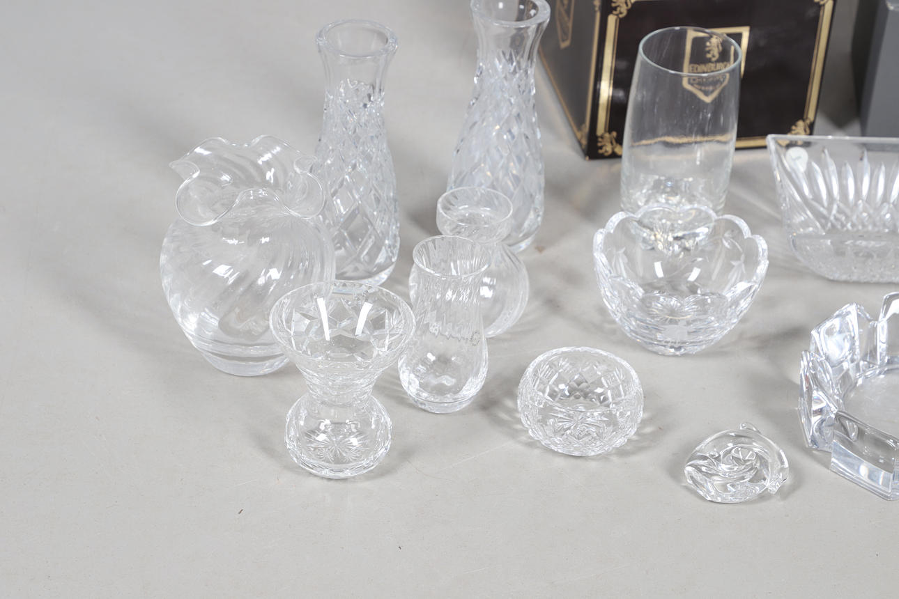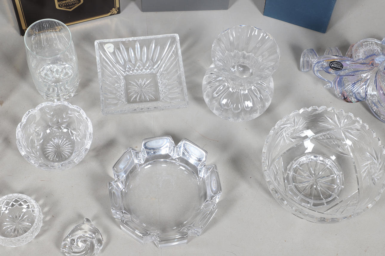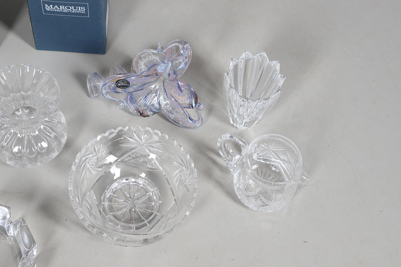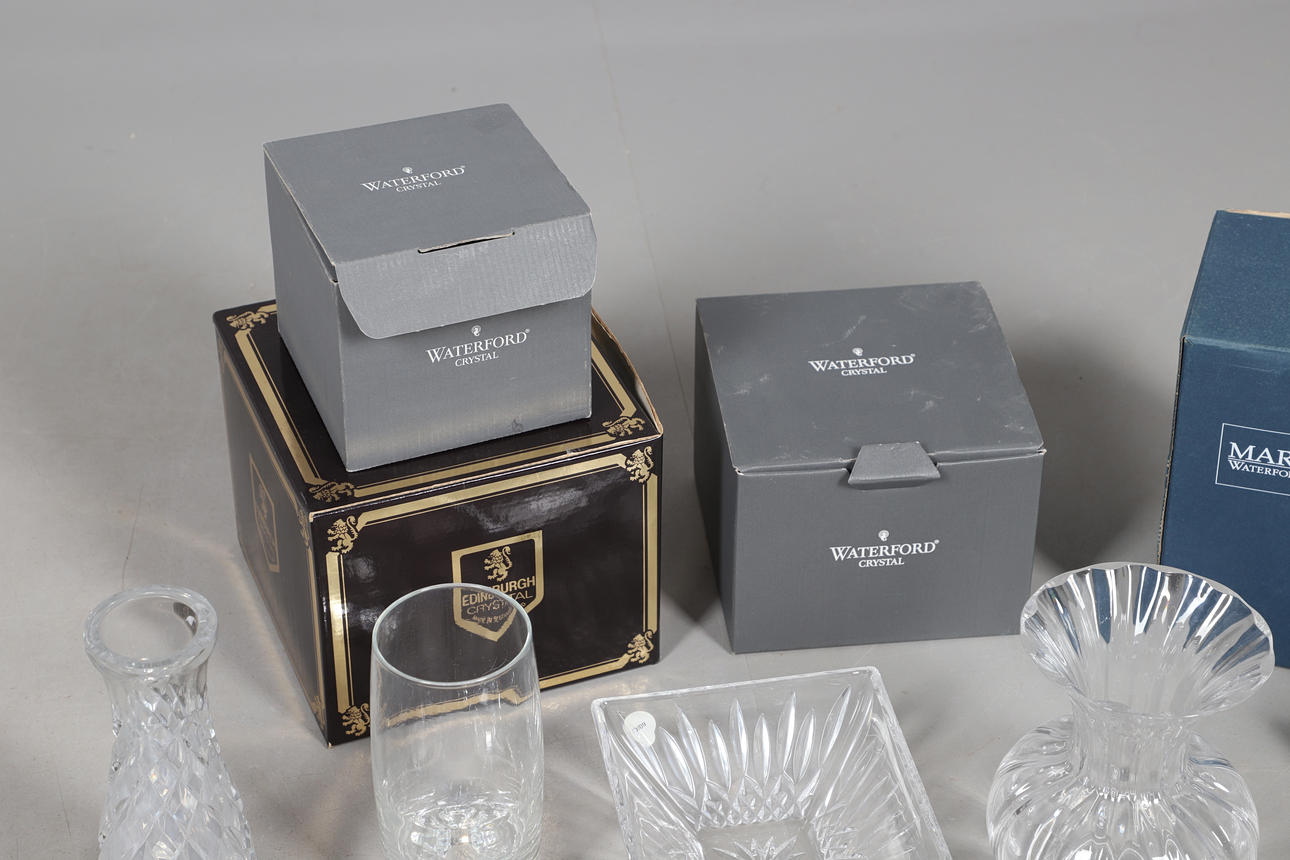 einschließlich eines Aschenbechers aus Orrefors-Glas, 18,5 cm Durchmesser, einer Orrefors-Glasvase mit gezackter Randform, 15 cm hoch, einer gedrehten Stängelblume aus Muranoglas, einem Paar geschliffener Glasvasen, 20 cm hoch, Waterford Crystal Nachttischleuhr, Waterford Crystal Topf und Deckel usw., einige mit Originalkartons.