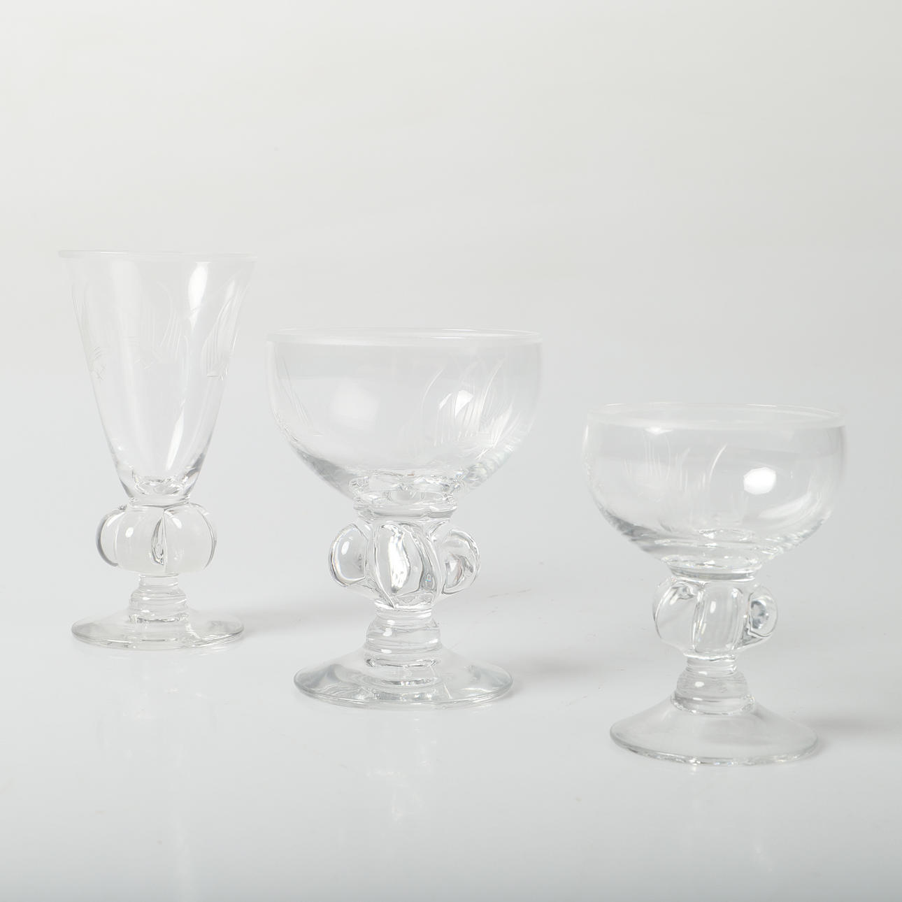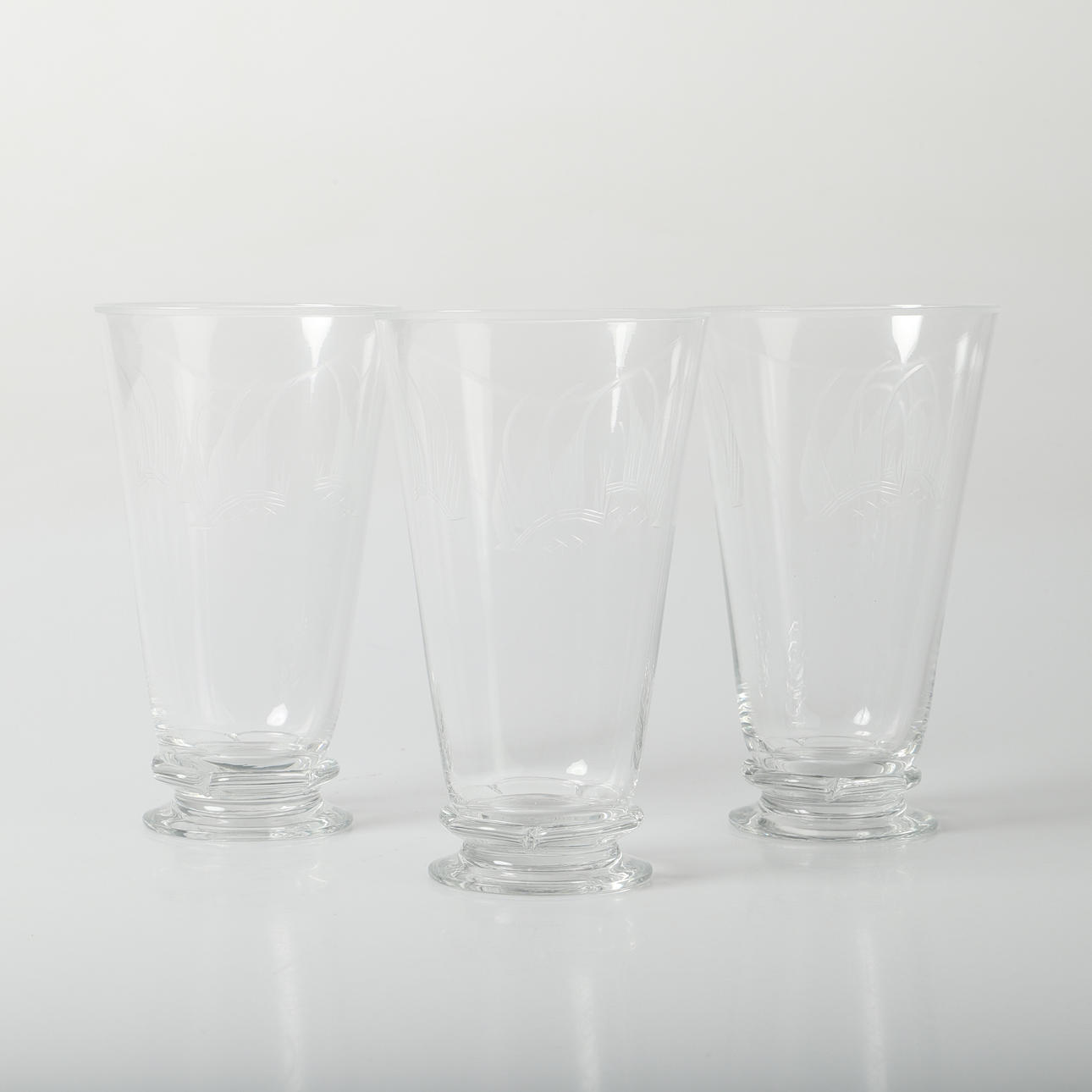 Gebrauchszustand, oberflächliche Gebrauchsspuren, 1 Weinglas mit Fußkerbe, 2 Schnappgläser mit minimalen Randabplatzungen.