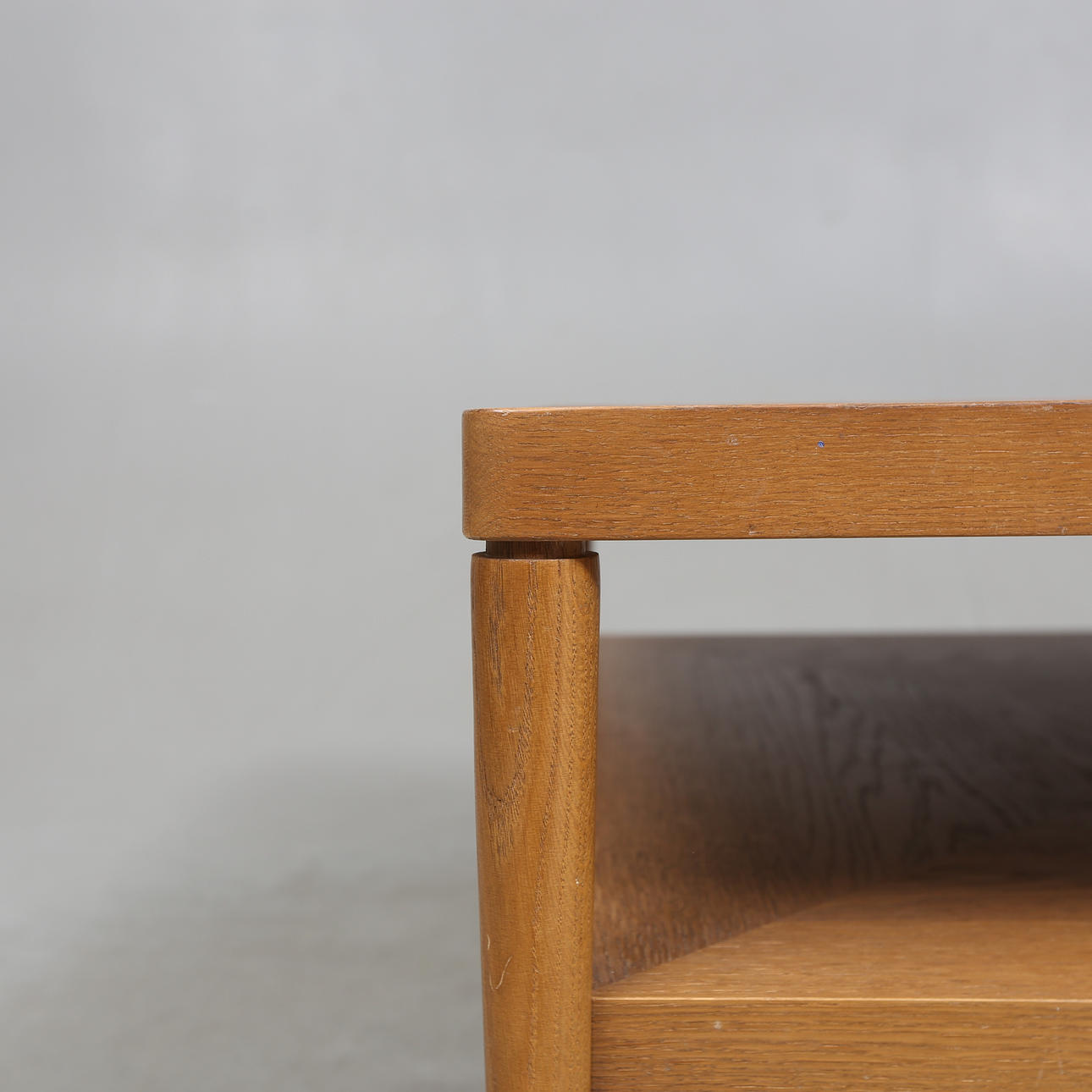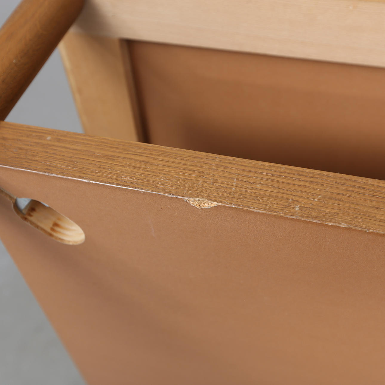 Verschleiß, Kratzer, Furnierabschürfungen. In den Regalen fehlen teilweise Befestigungsschrauben.