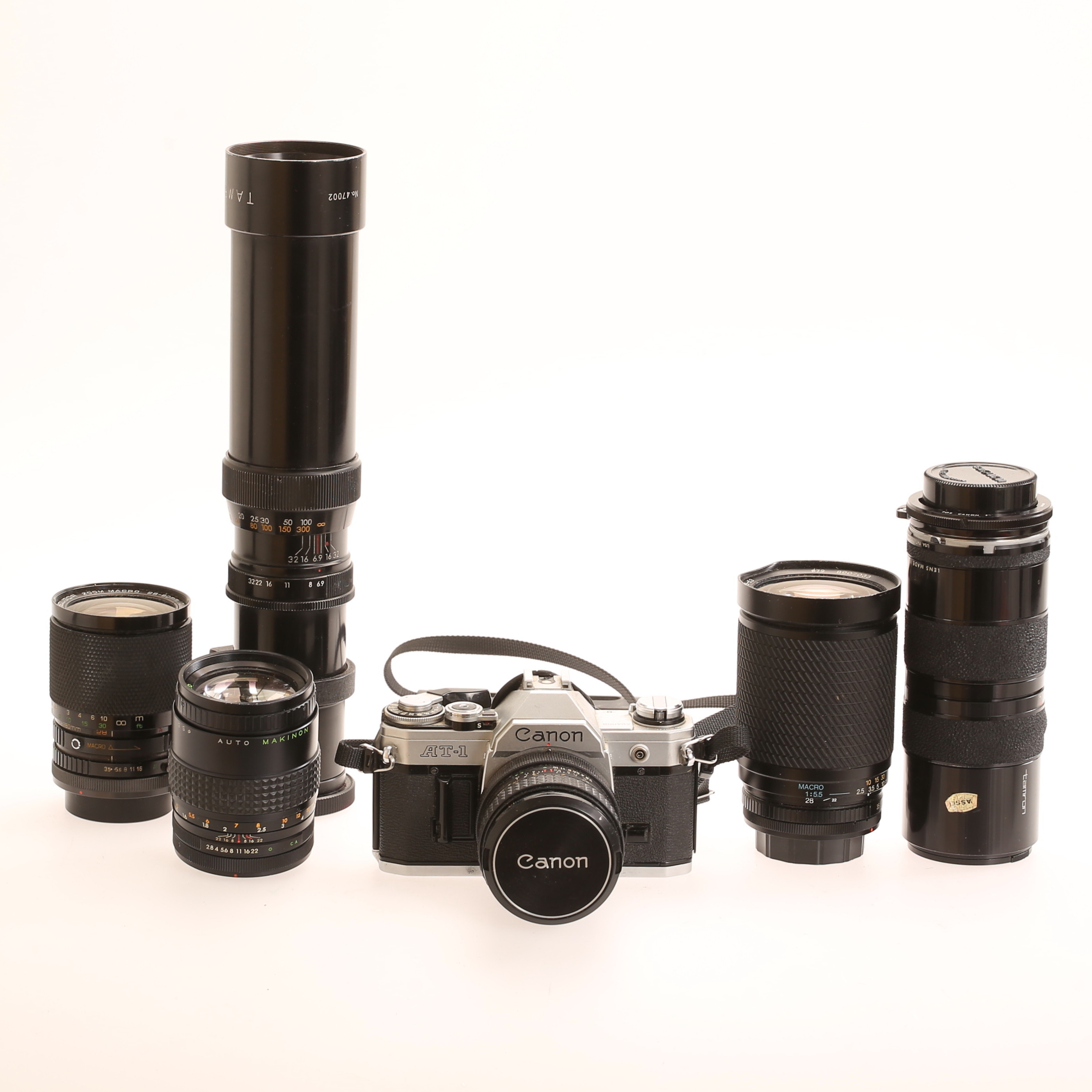 4363952. KAMERA, Canon AT-1 sowie 5-Objektiv.