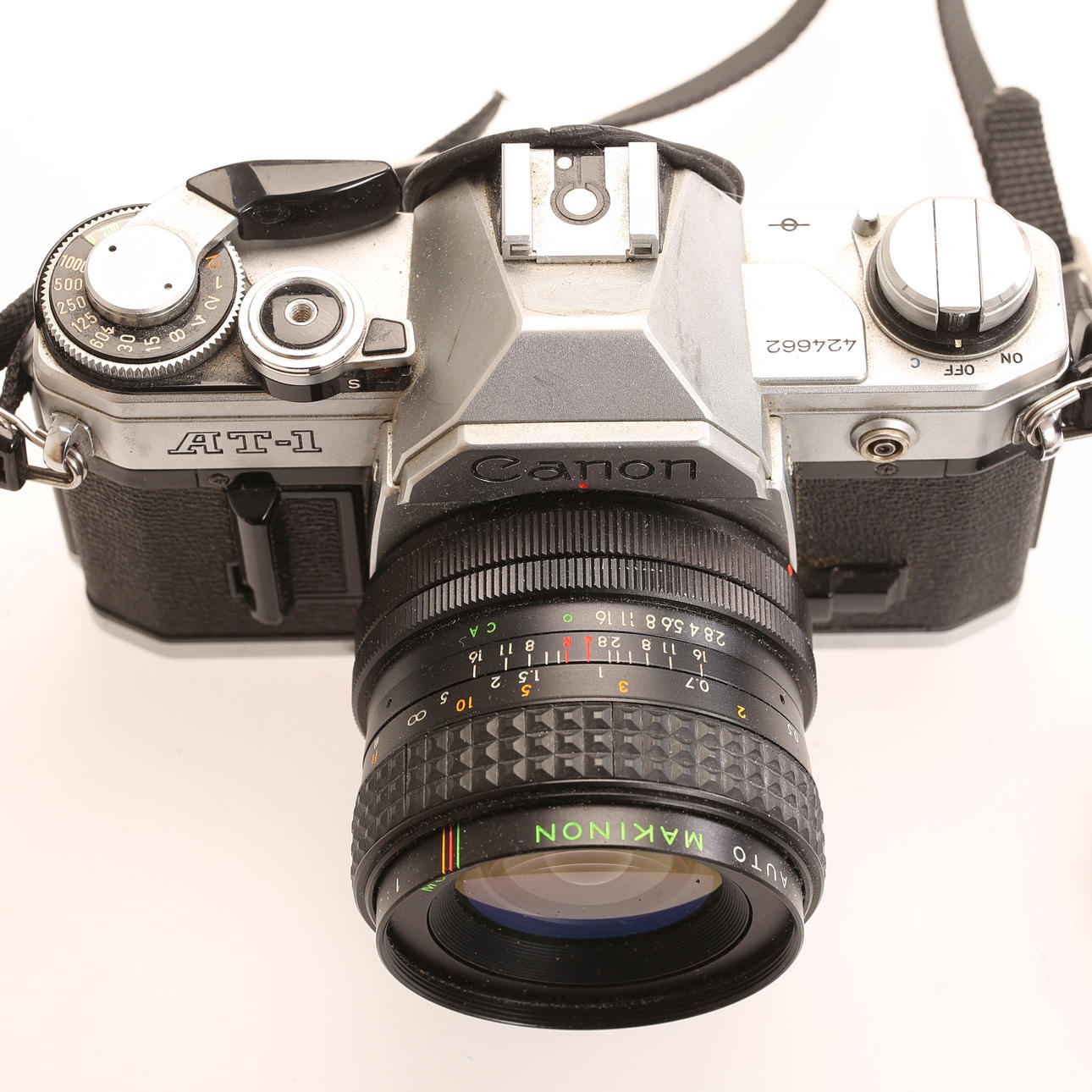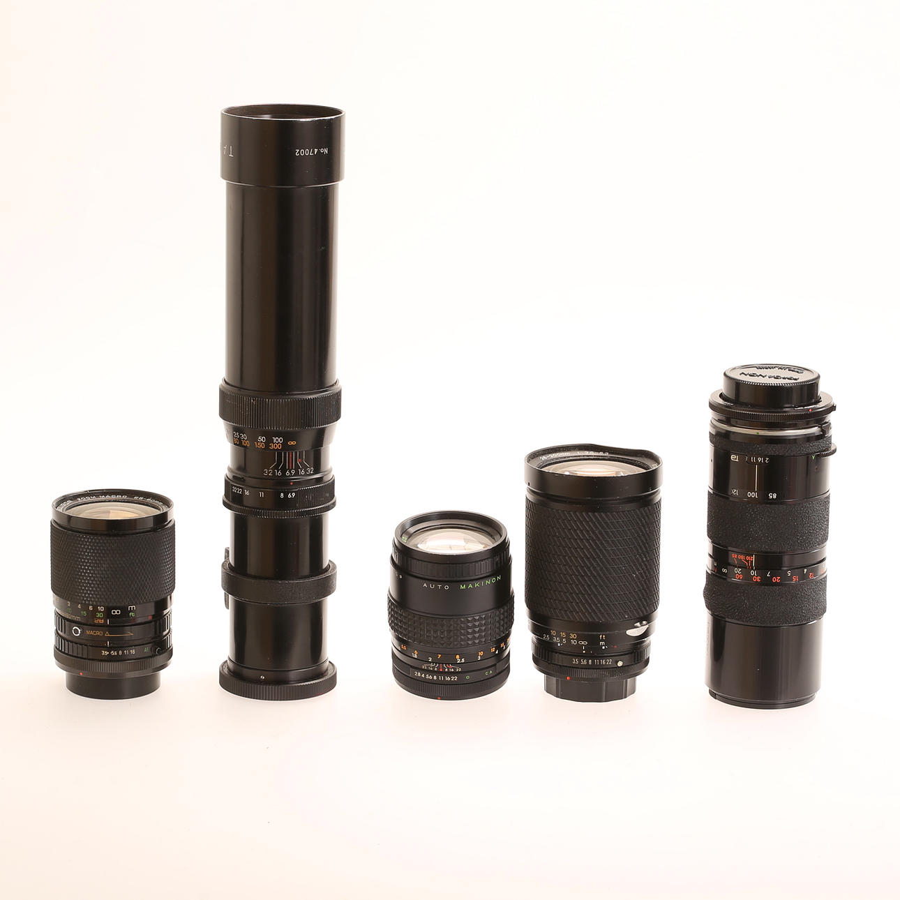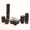 Kamera Canon AT-1, Objektiv Tamron 1:6,9, Soligor F:35-4,5, Makinon 135.mm usw. Länge ca. 8,5-31 cm Einige Fälle sind enthalten.