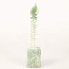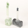 Ein Stopfen mit Auswurf und einer mit kleinerer Kerbe, eine Flasche mit Auswurf von Dekorelementen am Hals, Gebrauchszustand.