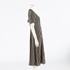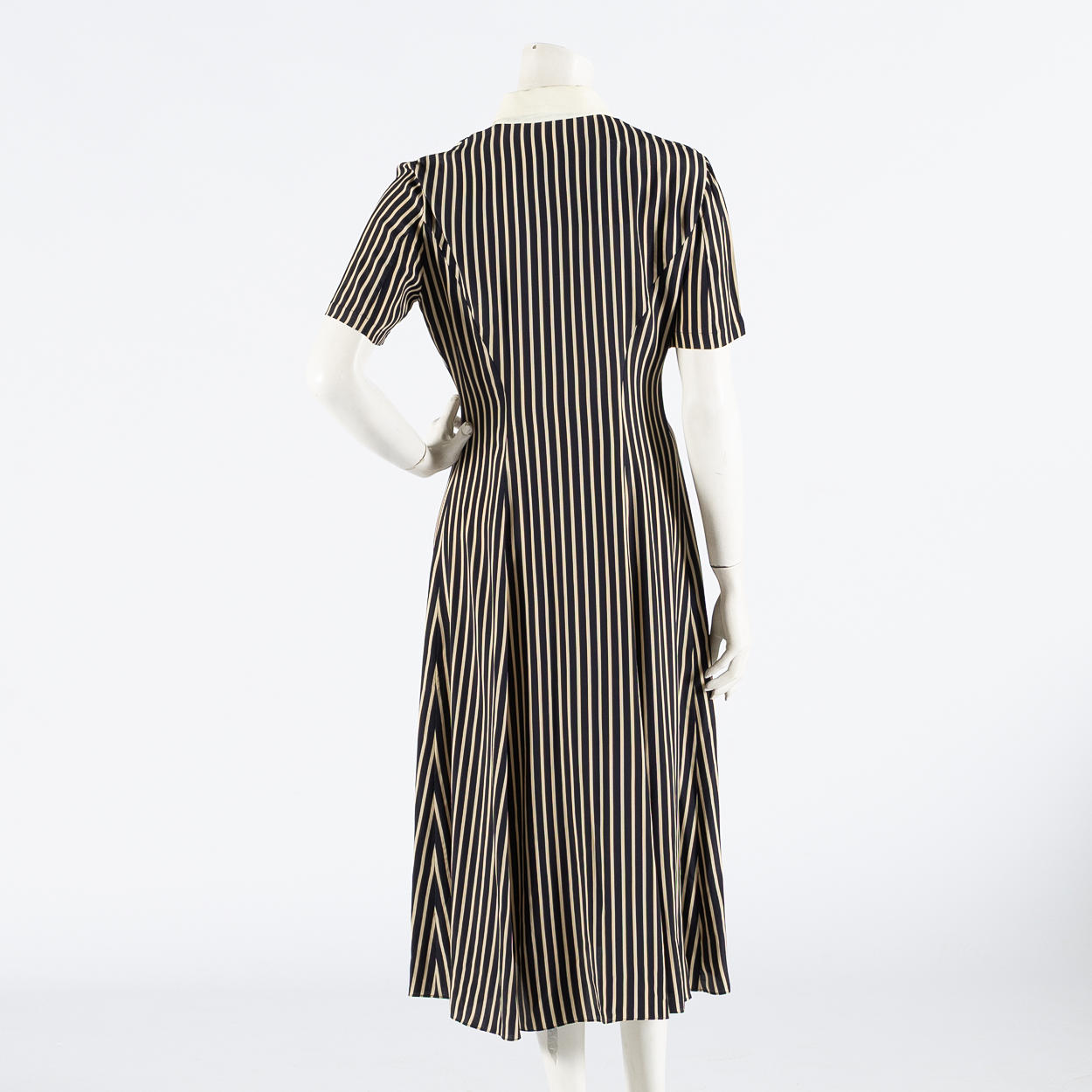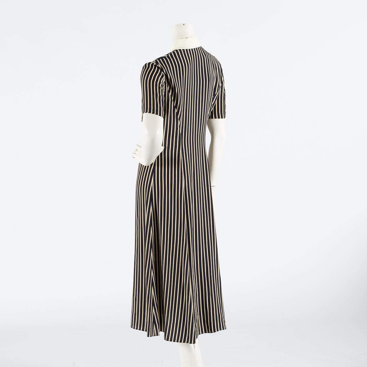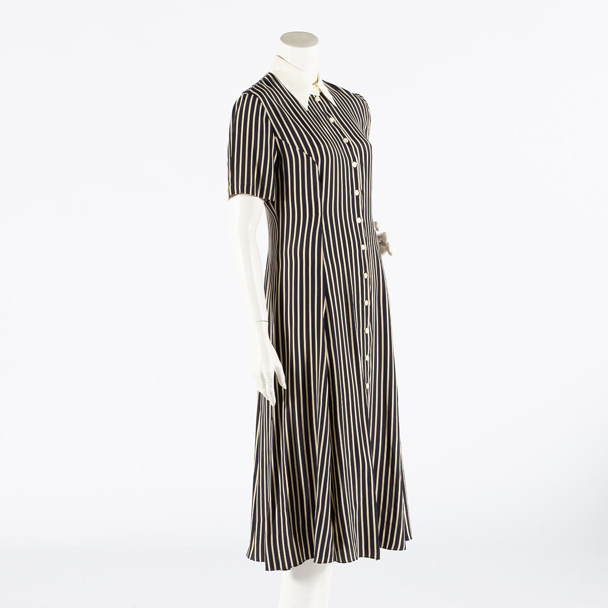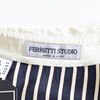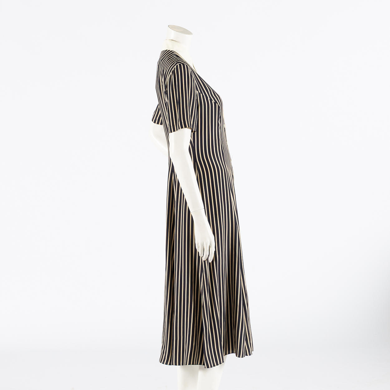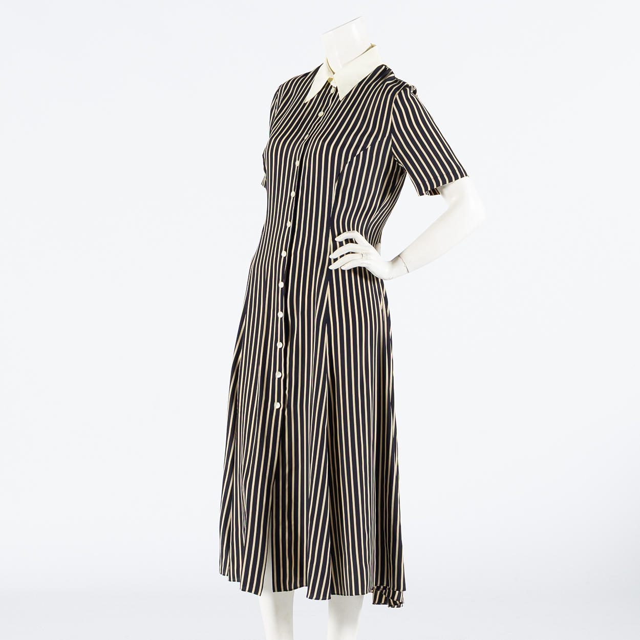 Gestreiftes Hemdkleid mit kurzen Ärmeln, cremefarbenem Kragen und geknöpfter Vorderseite. Farbgebung in Beige und Marineblau. 74 Acetat vor 26%. Gekennzeichnet mit FERRETI STUDIO, hergestellt in Italien. Größe I 44 D 40. Brustweite ca. 99 cm Länge ca. 120 cm