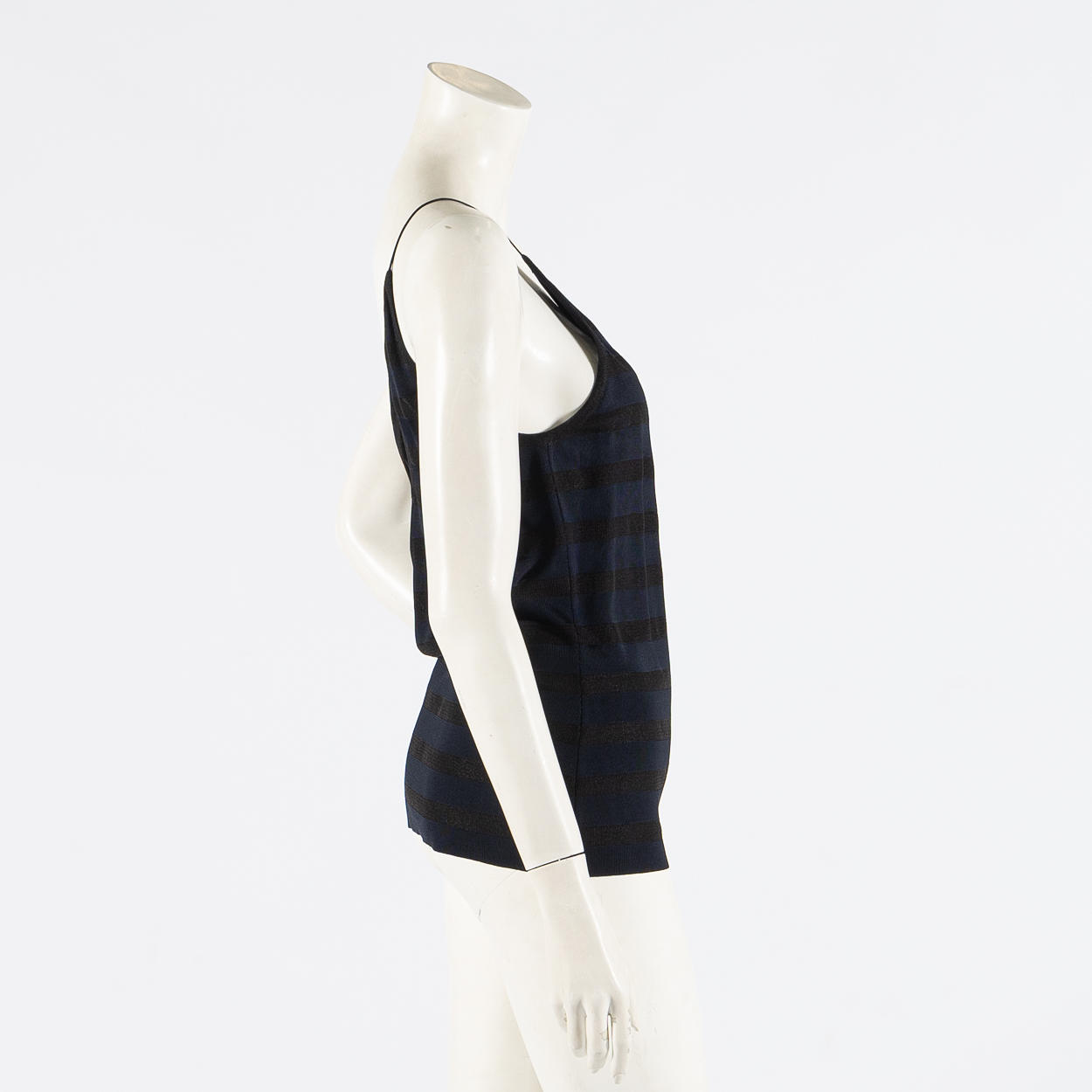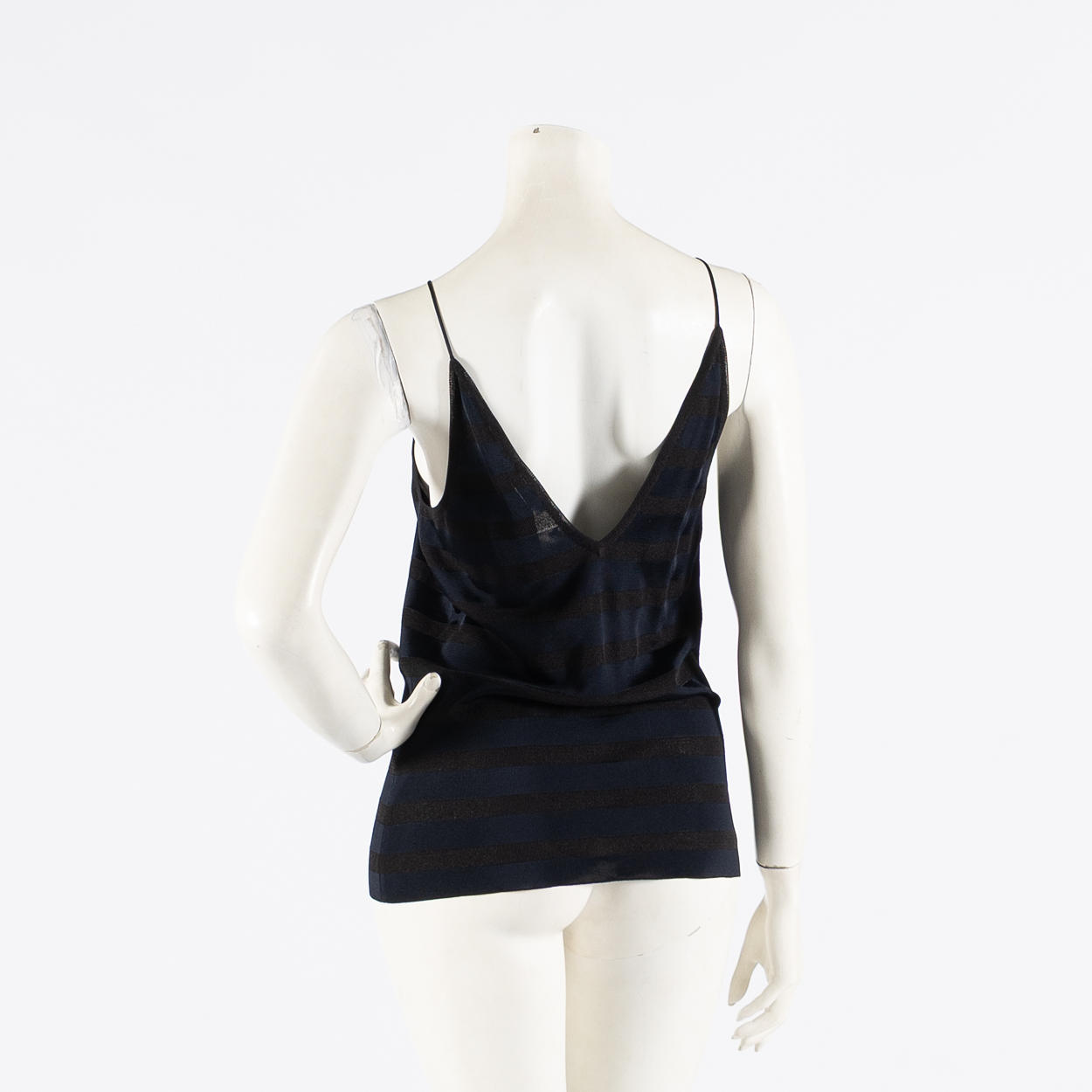 Gestreiftes Leinen aus glänzendem Feinstrickpolyester und Viskose mit schmalen Schulterriemen. V-Ausschnitt vorne und hinten. Verschlagwortet mit Giorgio Armani, hergestellt in Italien, 42. Brustweite ca. 84 cm Länge ca. 67 cm.