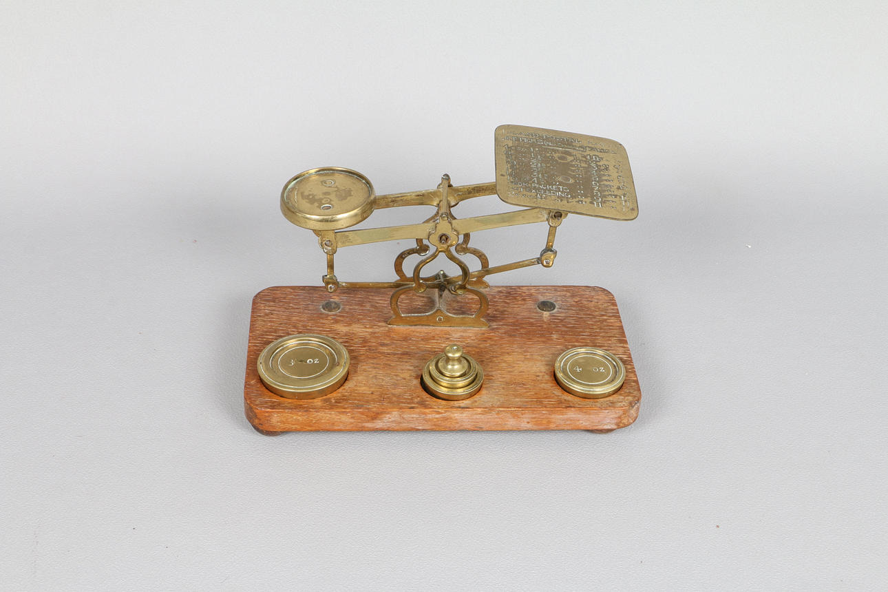 Die Postwaage auf einem Eichensockel, die auf vier Kugelfüßen steht, mit fünf Gewichten 1/2 Unzen, 1 Unzen, 2 Unzen, 4 Unzen und 8 Unzen, 14 cm hoch und 21 cm breit.