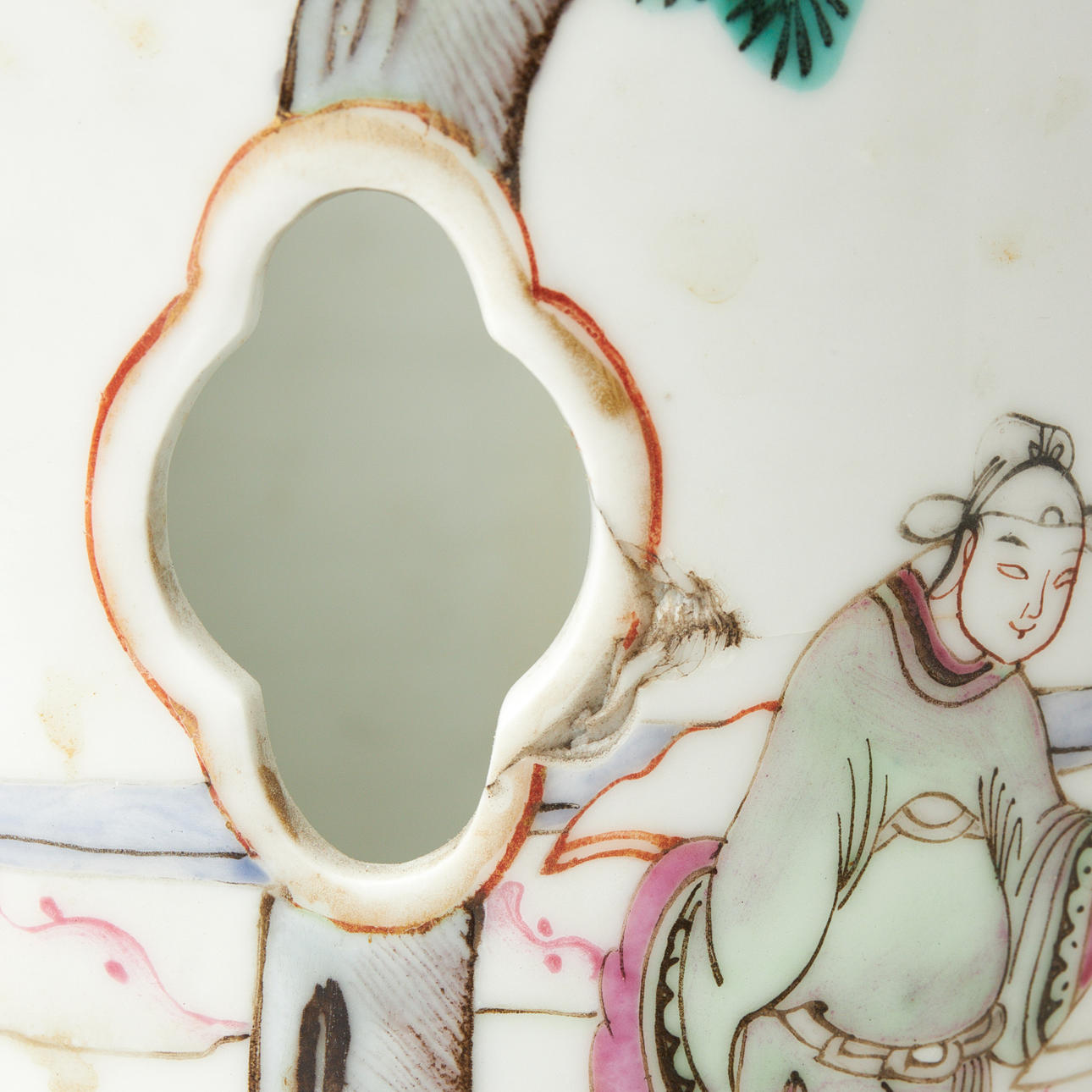 Gebrauchs- und altersbedingte Gebrauchsspuren, Produktionsdefekt/Beschädigung in einem der höheren Löcher am Baumstamm im Motiv.