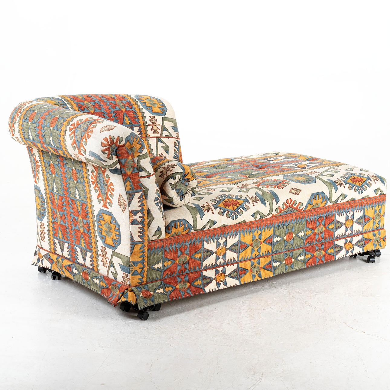 4373040. CHAISELONGUE, bezogen mit orientalischem Stoff.