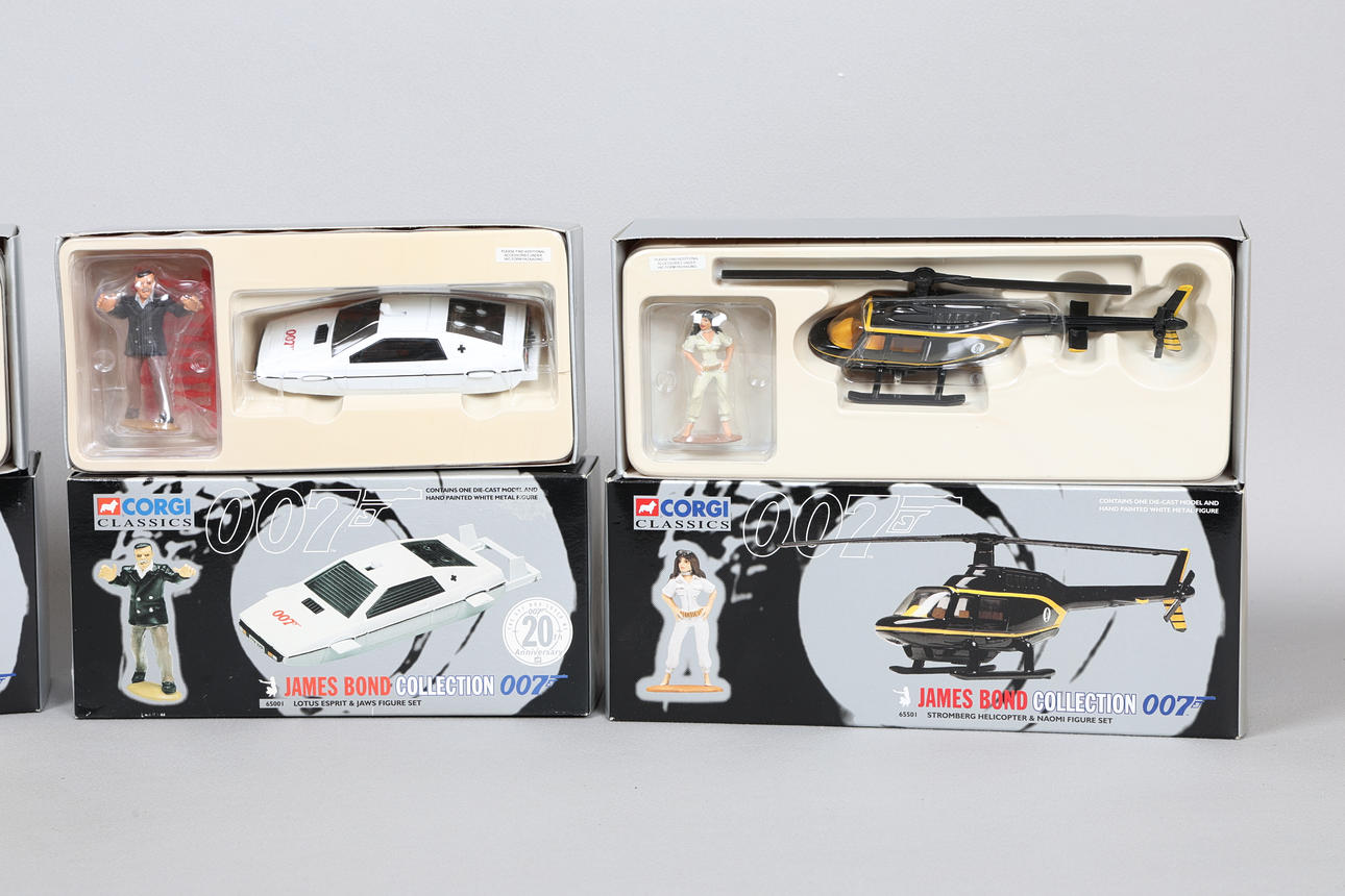 Dazu gehören das Lotus Esprit & Jaws Figurenset, das Citroen 2CV & James Bond Figurenset, das Stromberg Helicopter & Naomi Figurenset und ein Aston Martin DB5, alle verpackt, der größte 25,5 cm (4).