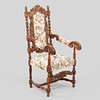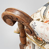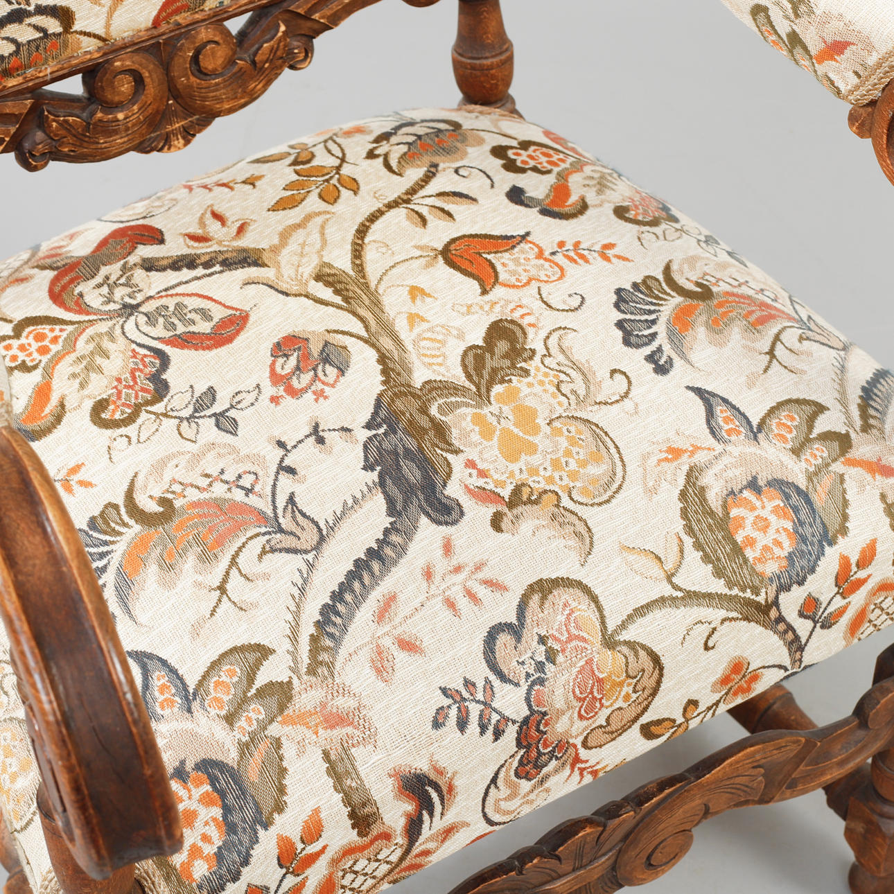 Rahmen aus gebeizter Eiche. Rückenablage, Armlehne und Sitz sind mit floralem Stoff bezogen. Sitzhöhe 47, Breite 59, Tiefe 61, Höhe 124 cm.