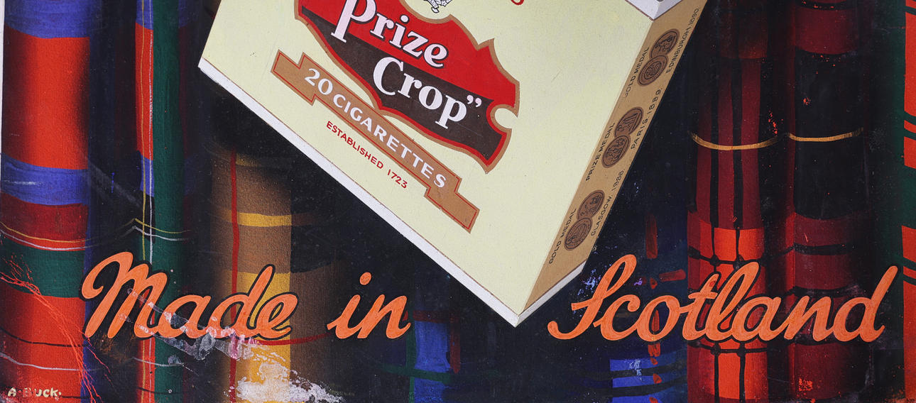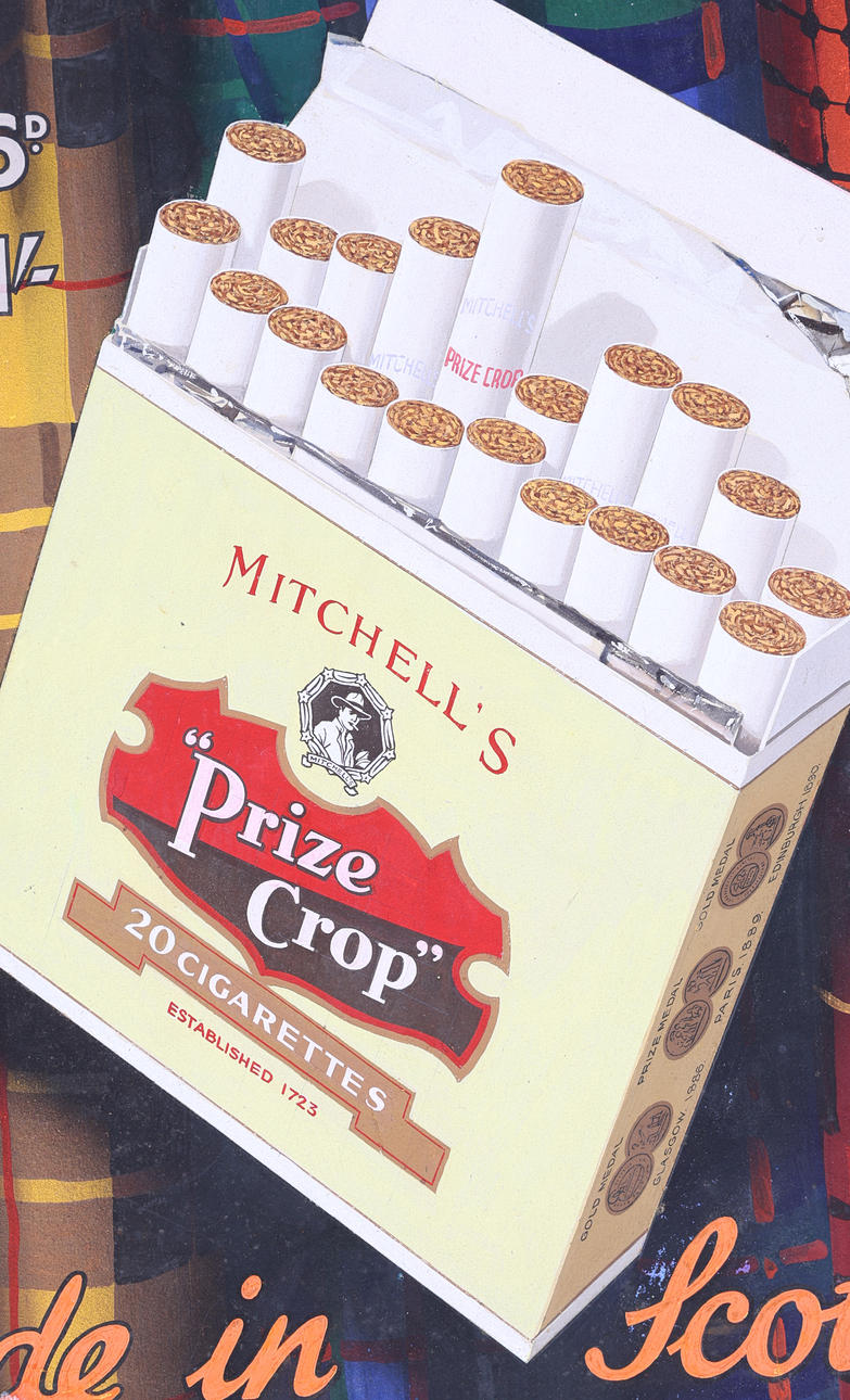„Mitchells „Prize Crop“ -Zigaretten 10 für 6d 20 for 1' — Made In Scotland“, das Modell eines Werbeschilds aus dem 20. Jahrhundert an Bord, das eine Packung Prize Crop-Zigaretten mit Schottenmuster zeigt, signiert A. Buck, auf der Rückseite mit dem Copyright für „James Laworth & Bro., LTD.“ gestempelt. Londres.', 76 cm x 50,5 cm.