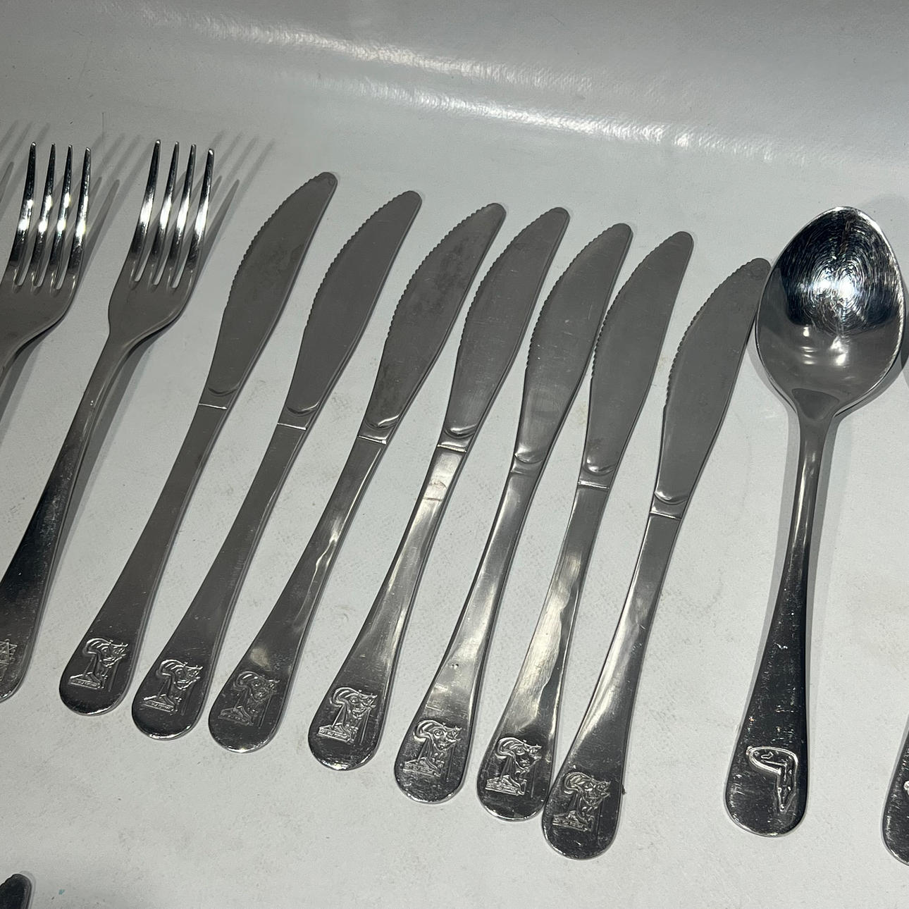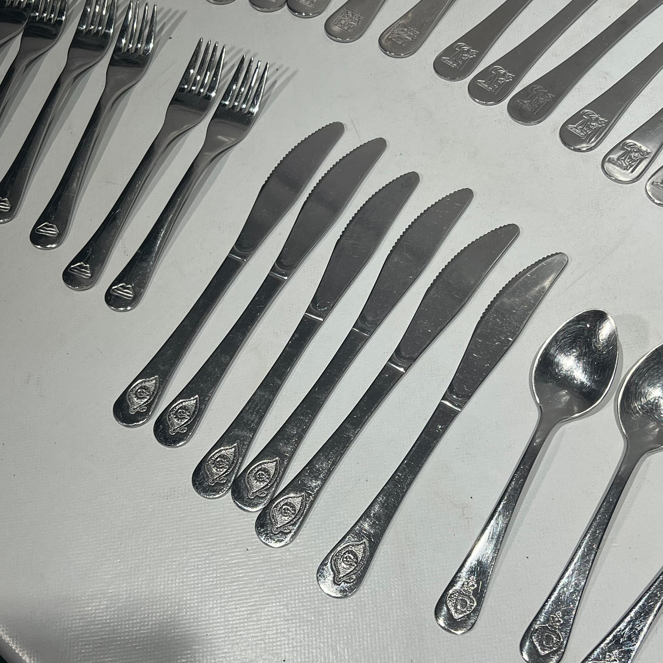 Bestehend aus sieben Gabeln, sieben Messern, sieben Löffeln, sechs Dessertgabeln, sechs Dessertmessern und sechs Dessertlöffeln. Alle mit unterschiedlichen Dekorationen im Zusammenhang mit der Arbeit von Salvador Dalí.