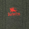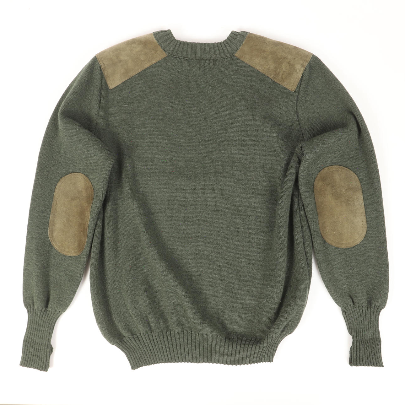 Grüner Strickpullover, verstärkt mit Veloursleder an Ellbogen und Schulter