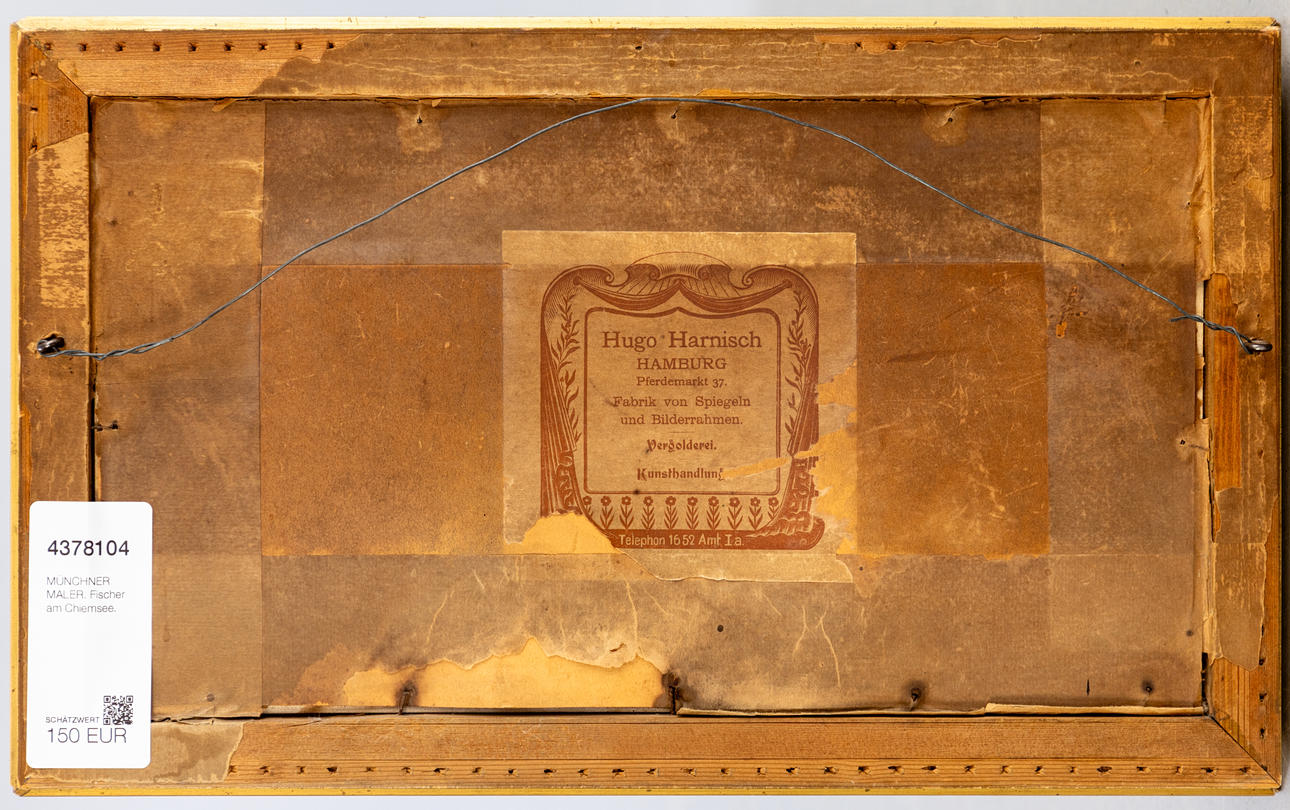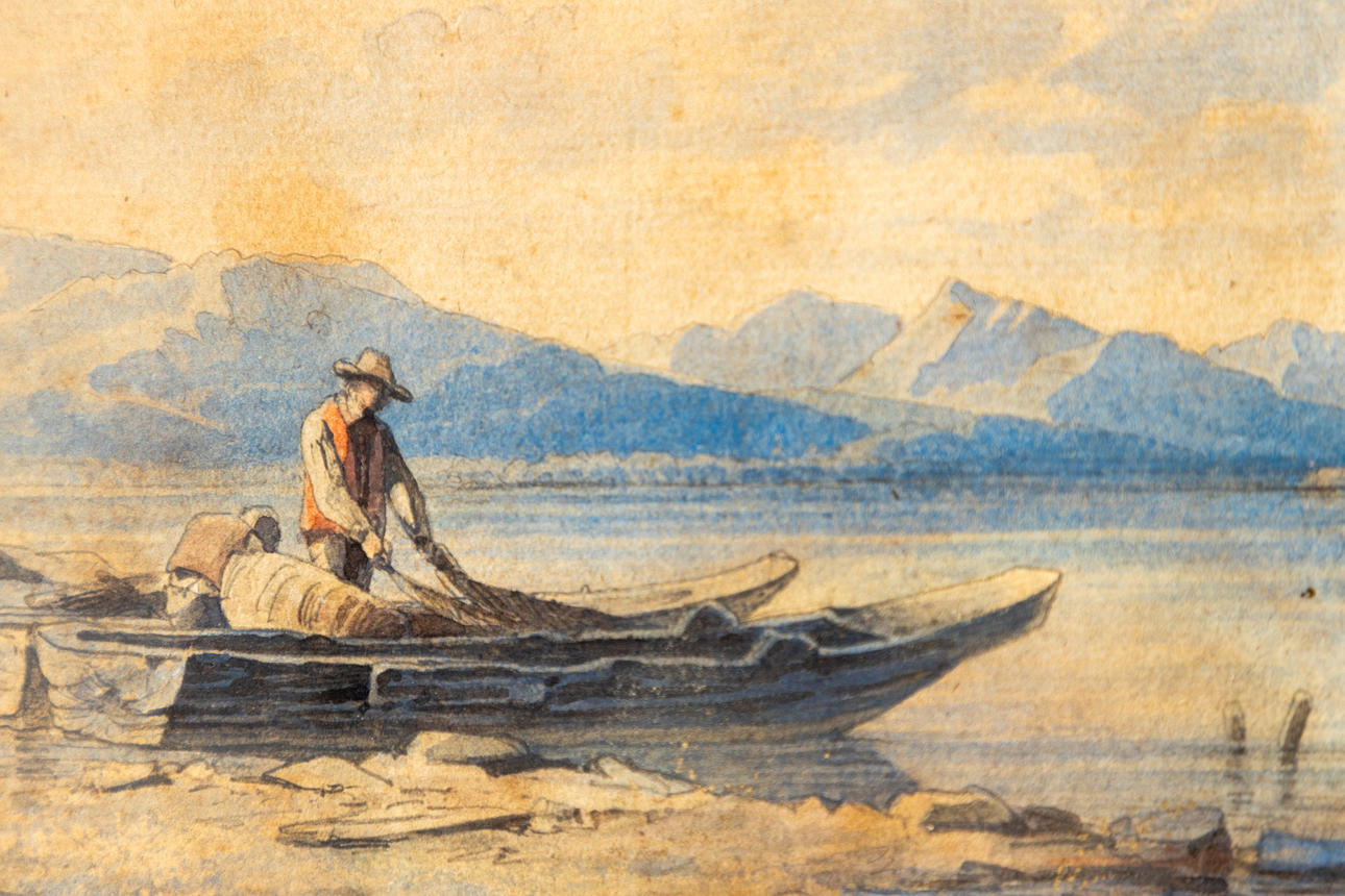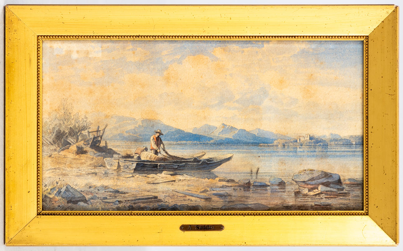 Münchner Maler, Ende 19. Jahrhundert, Fischer am Chiemsee, Aquarell über Bleisitift, ehemals zugeschrieben August Seidel (1820-1904), ca. 19 x 36 cm, hinter Glas gerahmt, mit Rahmen ca. 27 x 43 cm.
