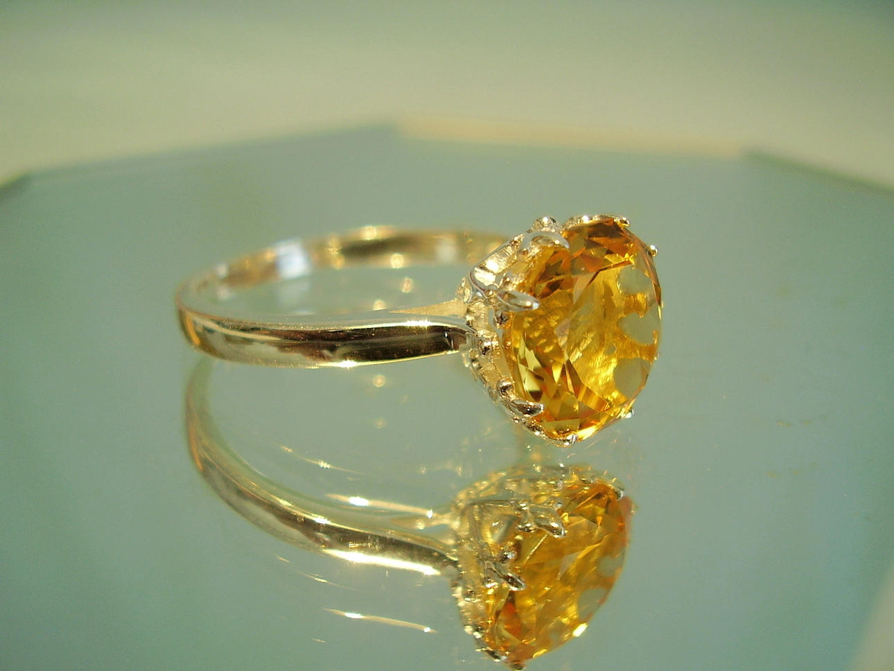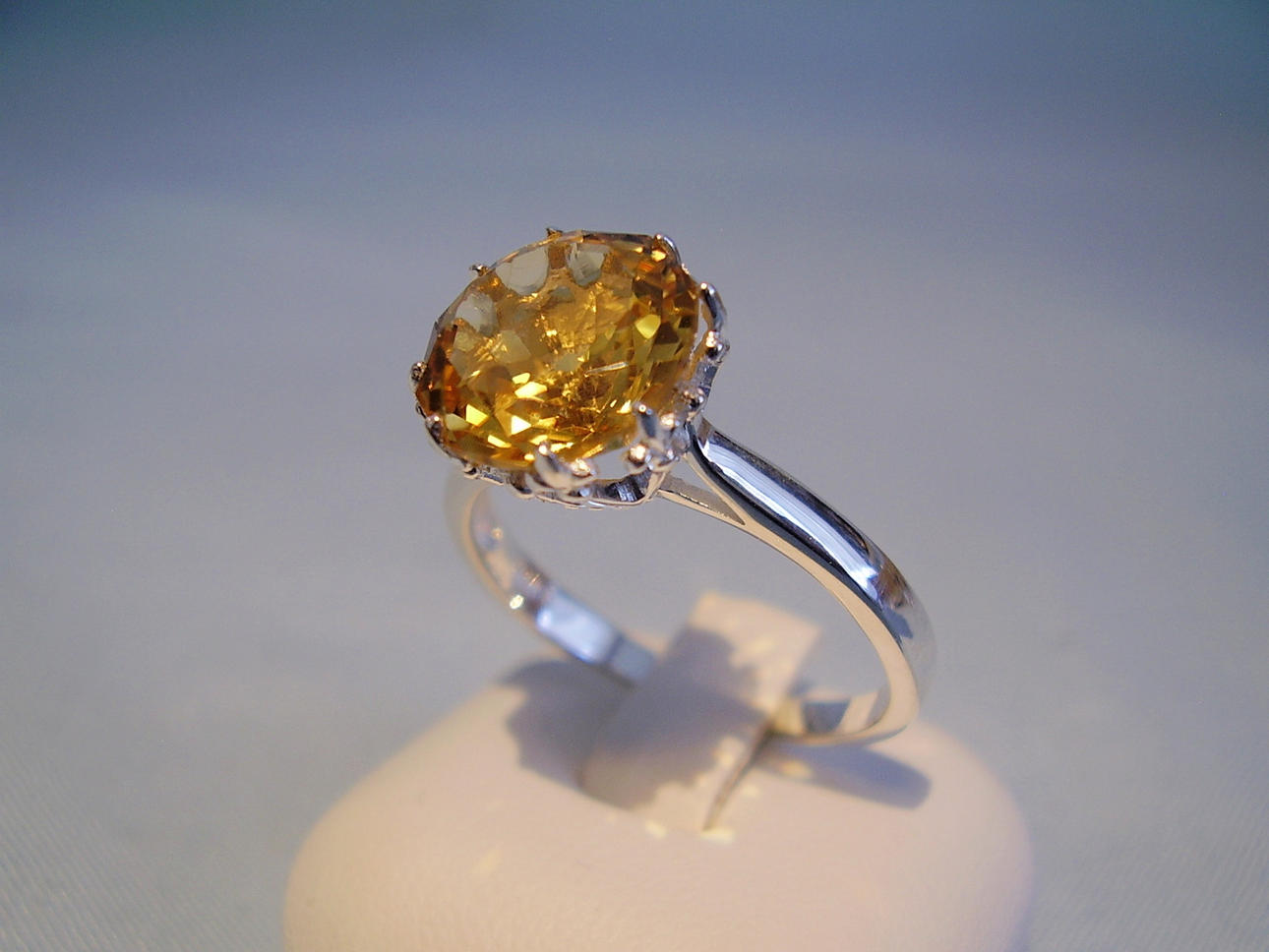 Der Ring ist in Silber 925 gearbeitet und auch so punziert. Der Ringkopf ist besetzt mit einem rund facettierten goldgelben Citrin von 10 mm Durchmesser.