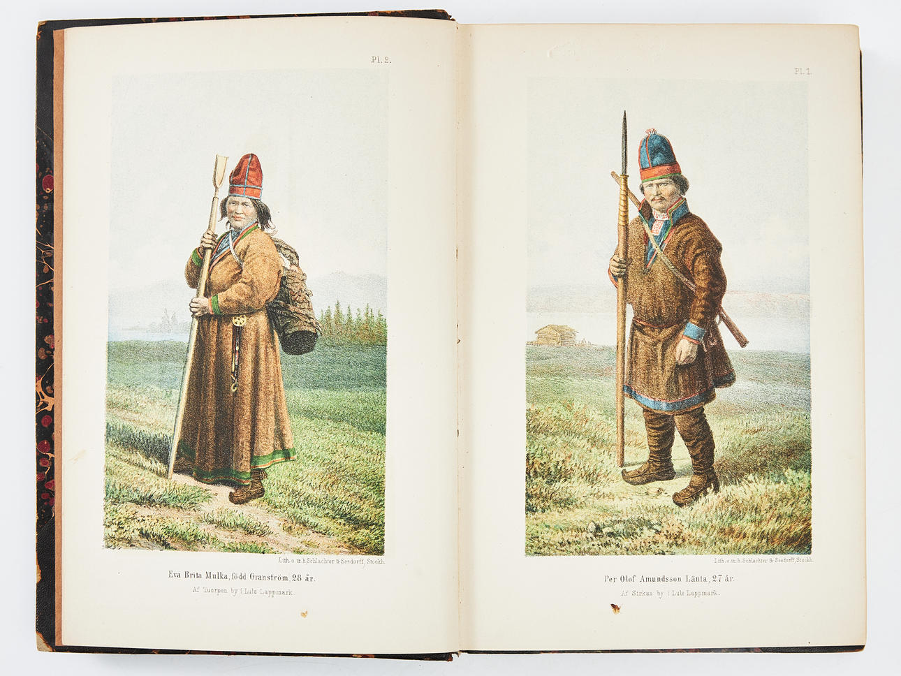 8:o. 250 x 180 mm Illustriert. 8 lithografierte Tafeln, davon 2 in Farbe, 1 große faltbare Farblithografiekarte. Leicht abgenutztes zeitgenössisches halbfranzösisches Band mit fünf erhabenen Bänden, Verzierungen und Titel in Gold auf der Rückseite, marmoriertes Einbandpapier und Schnitt, Deckblatt fehlt. Erste Ausgabe.