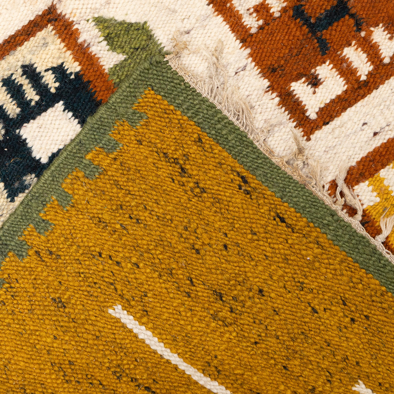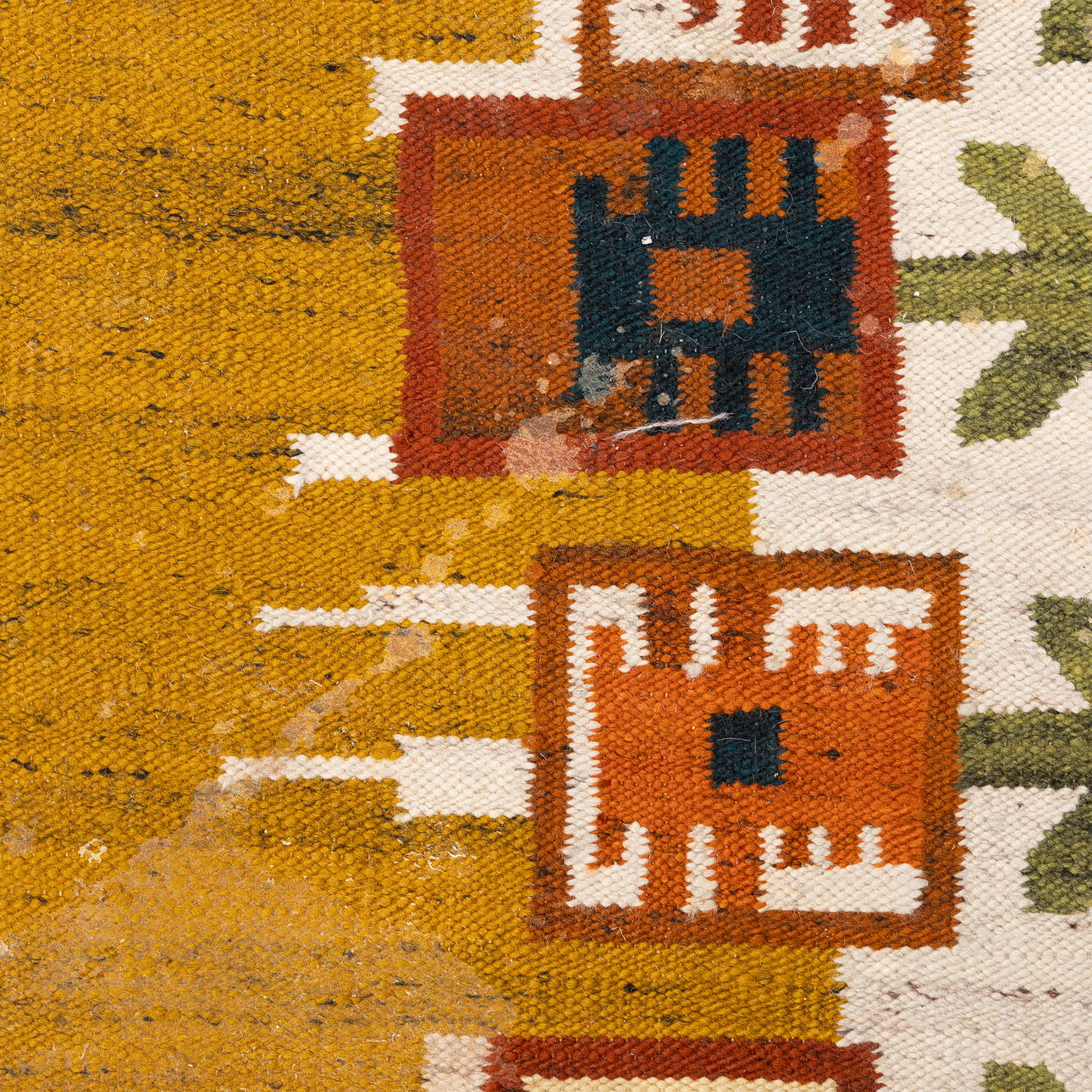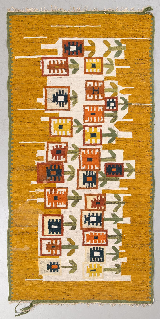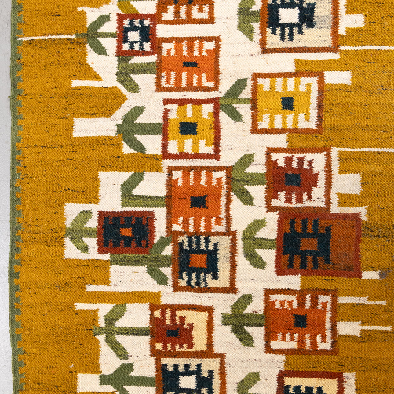 Flachgewebt aus Wolle auf Leinenkette, unsigniert. Blumenmuster in einer breiten Farbpalette.