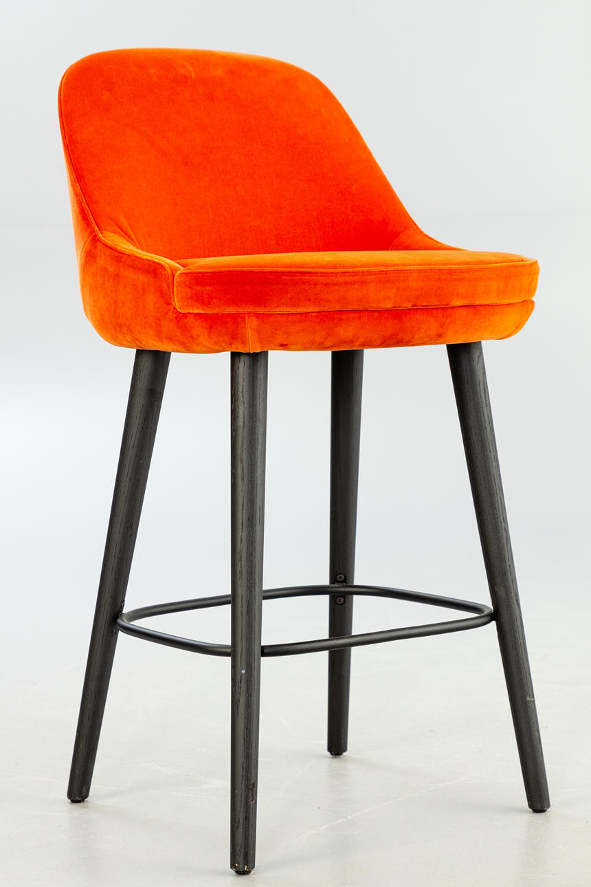 Schwarz lackiertes Holz, aufgepolsterte Sitzschale. Bezug: Harald-512 Pumpkin.
