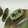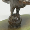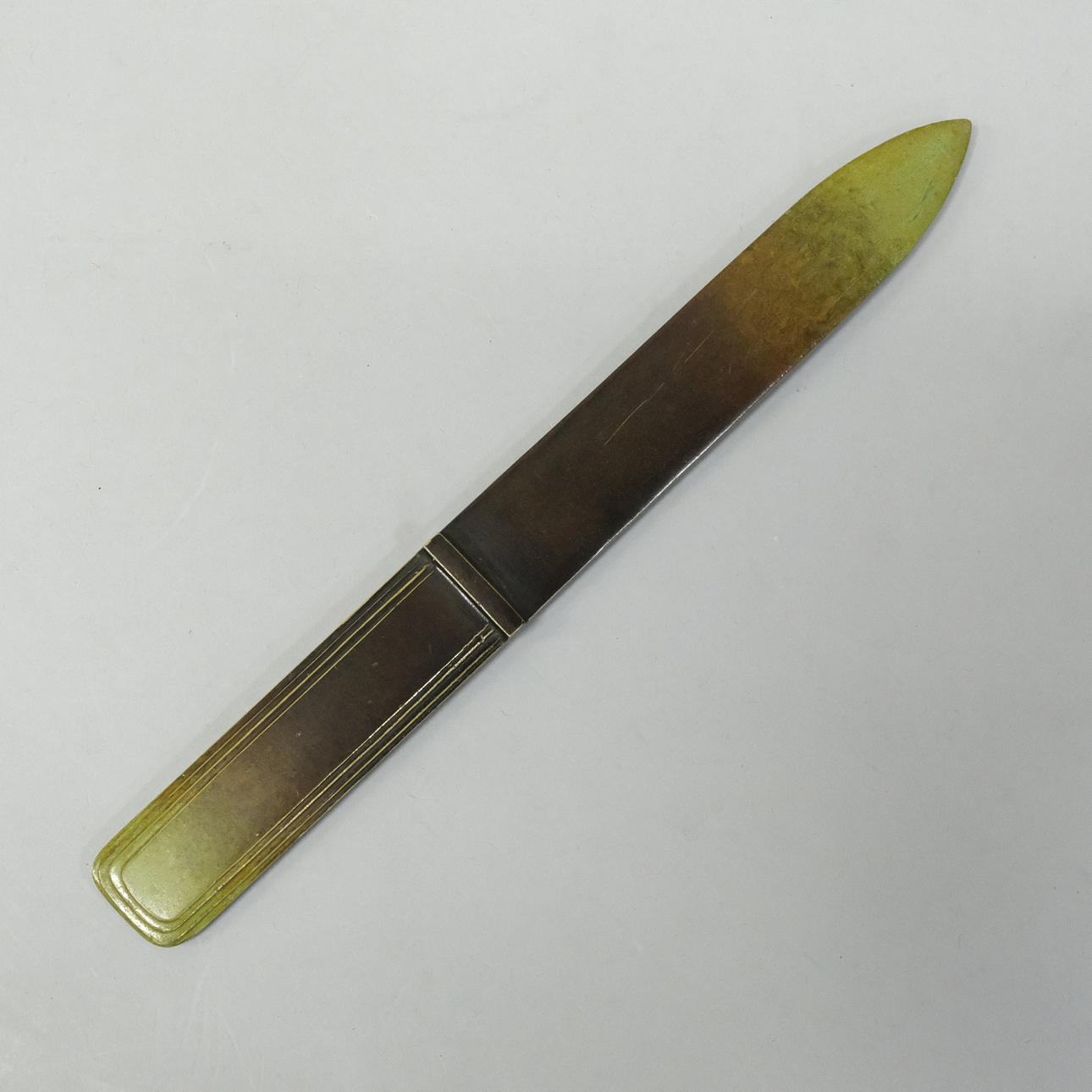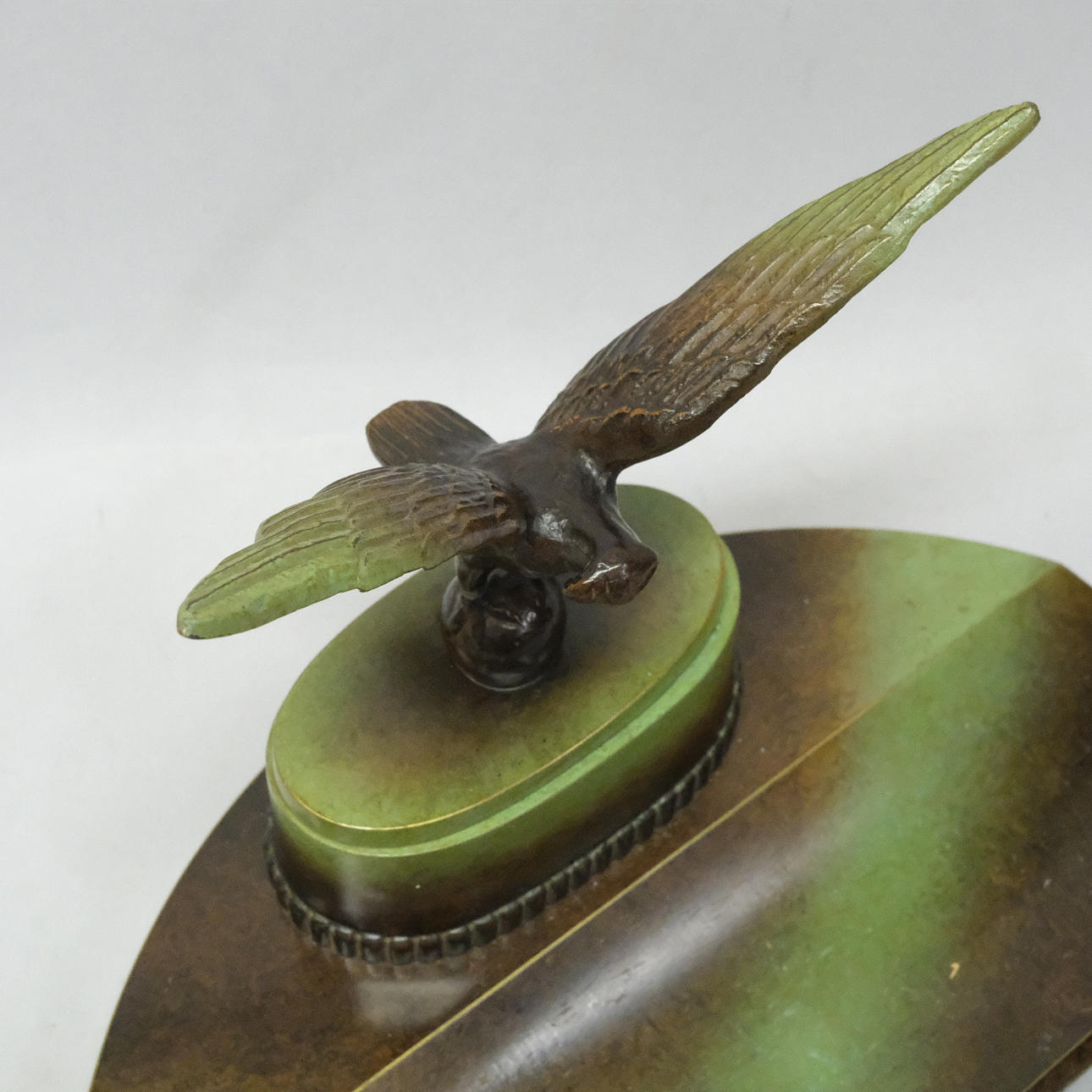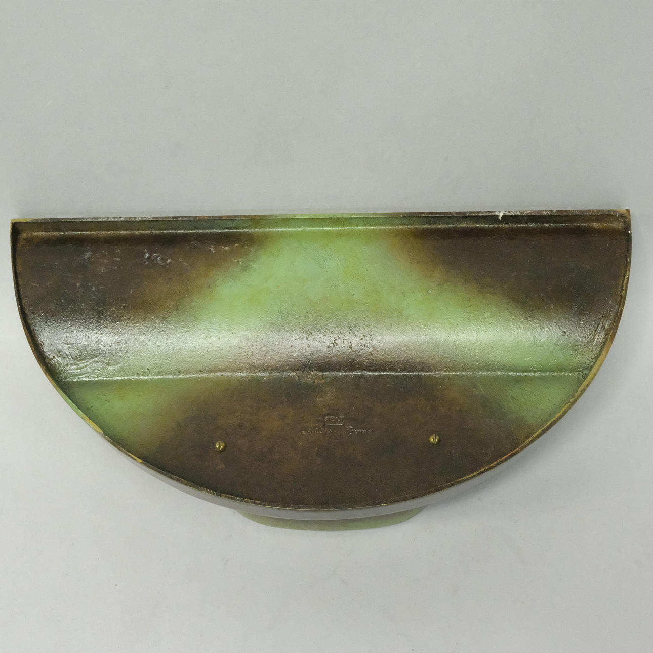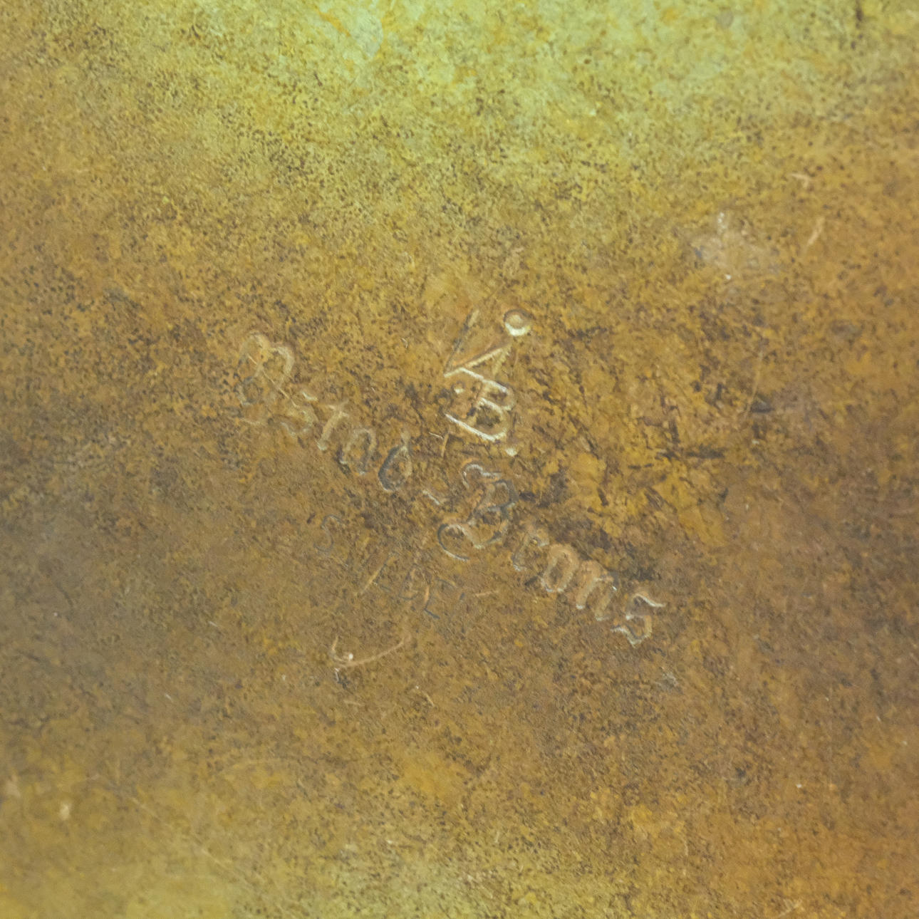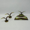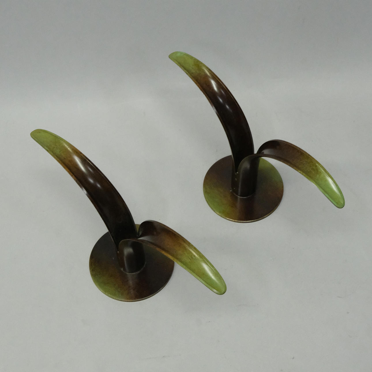 Bronze, grün und braun patiniert: Ivar Åhlénius-Björk, 1 Paar Kerzenständer, „Lily“, Höhe 12 cm; 1 Schreibständer mit 2 Glastinten, Länge 30,5 cm und 1 Schreibwarenmesser, Länge 25,5 cm.
