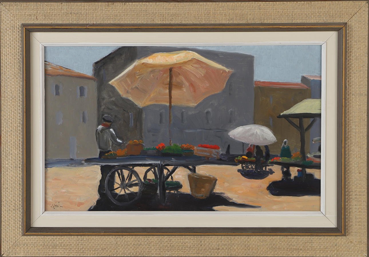 OIDENTIFIERAD KONSTNÄR. Marktladen, Öl auf Holz, undeutlich signiert.