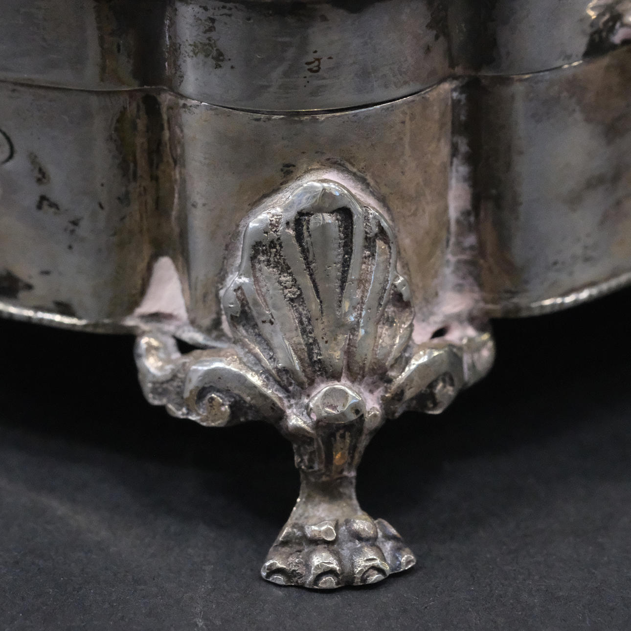 Mit Rocailles und Blumen verziertes Relief sowie Pfotenfüßen.