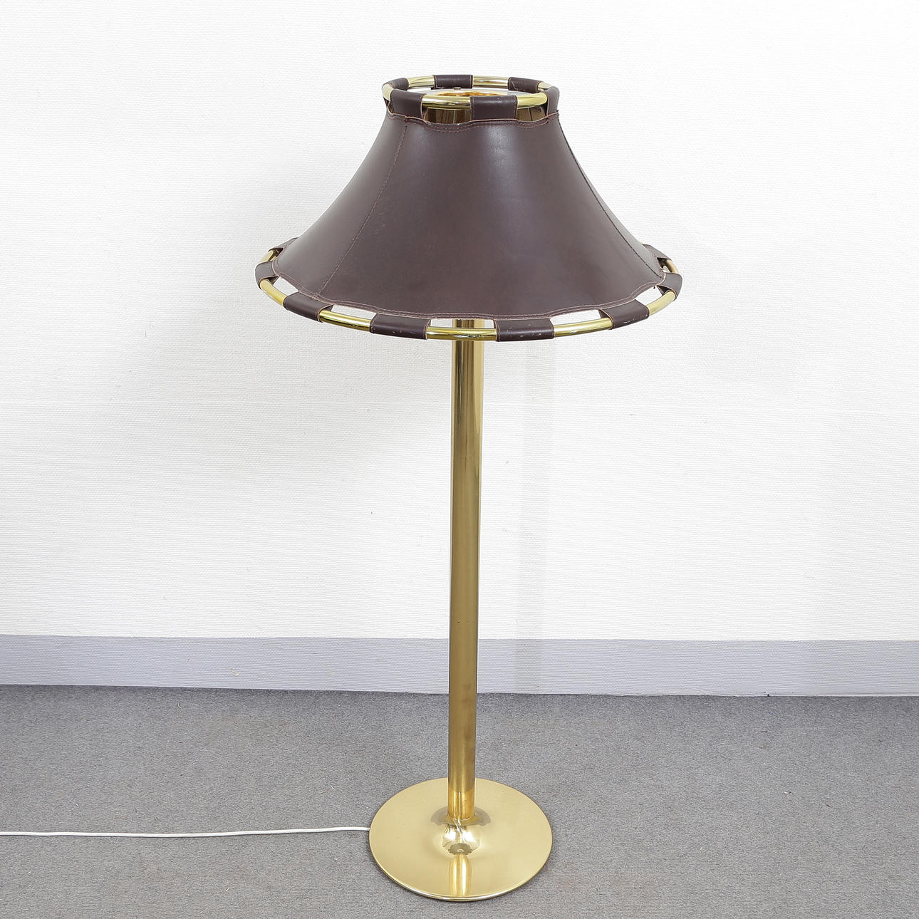 ANNA EHRNER. STEHLAMPE, ECHTLEDERSCHIRM, MESSING, ATELIERLATERNE.