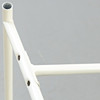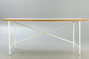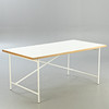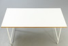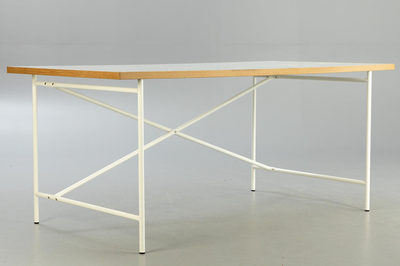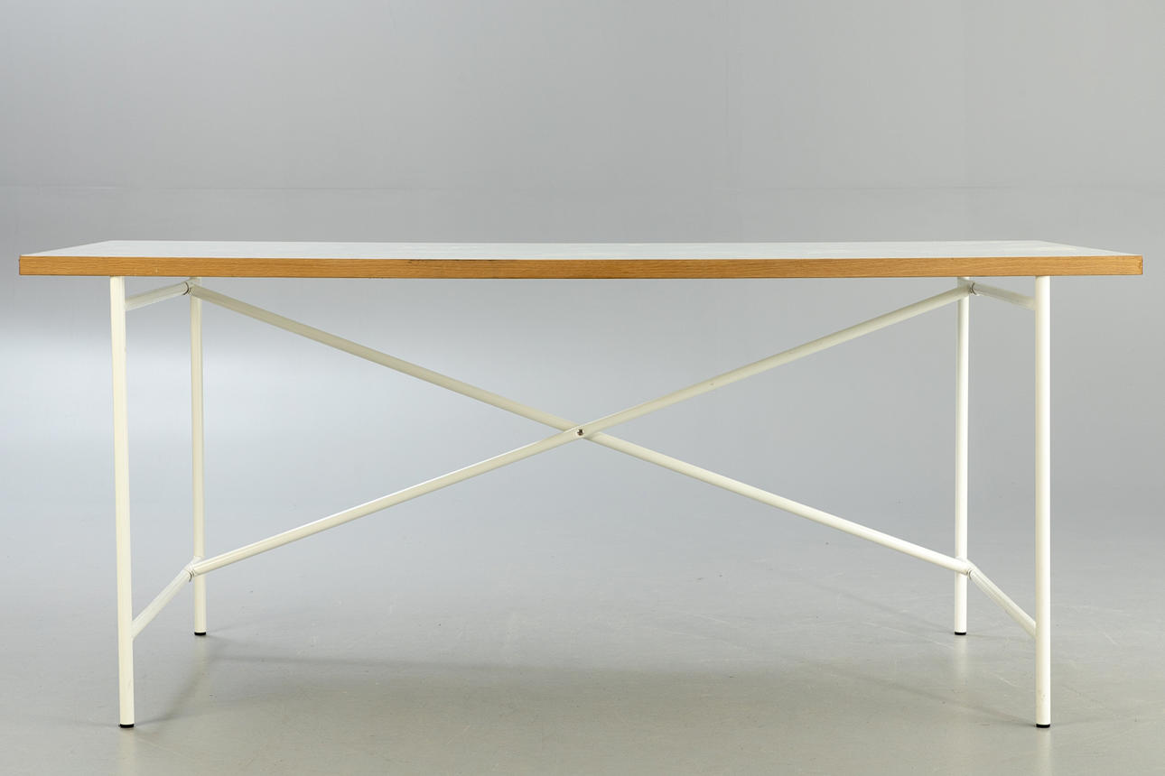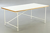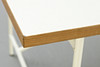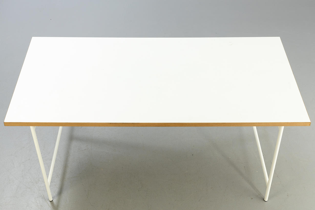 Entwurf: 1965. Gestell weiß lackiert. Senkrechte Verstrebung nach hinten versetzt. Lose Tischplatte mit Laminat in weiß.