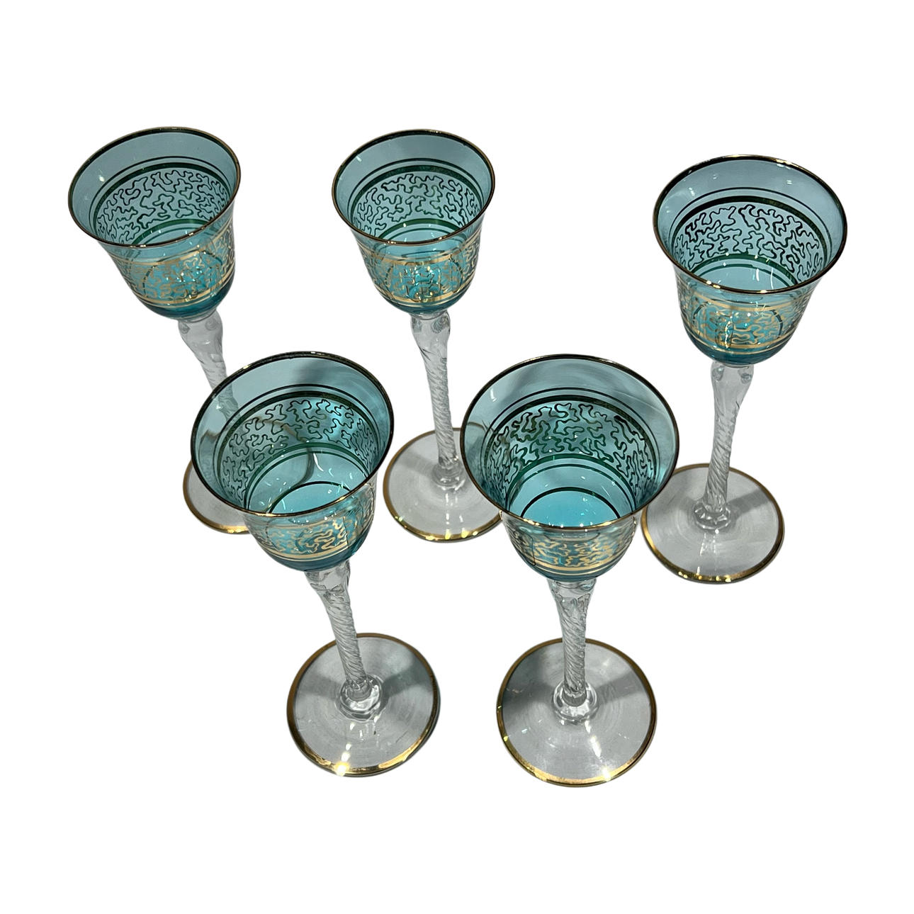 Set mit 5 blauen Kristallgläsern mit Golddekor.