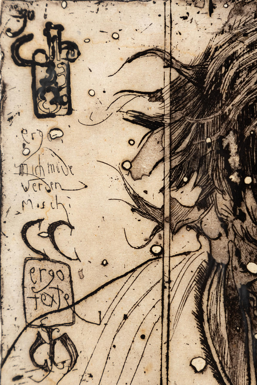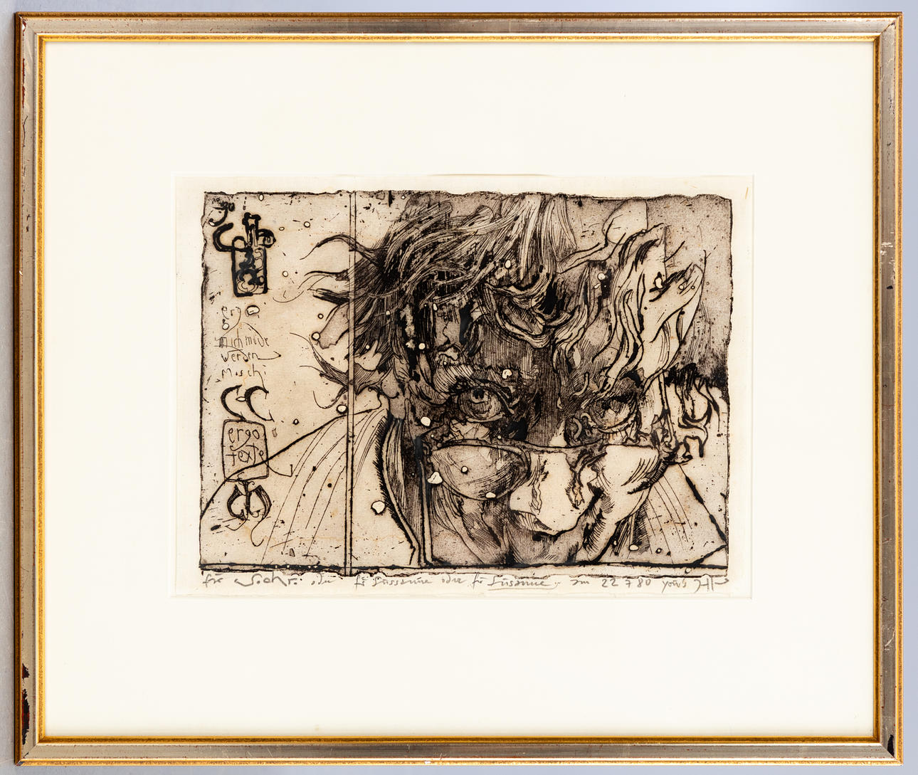 Horst Janssen (1929-1995), Ergo nich müde werden, Michi, Radierung, 1980, signiert, datiert und gewidmet, in der Platte zusätzlich datiert und betitelt, ca. 20,5 x 28,5 cm. hinter Glas gerahmt, mit Rahmen ca. 40,5 x 47 cm.