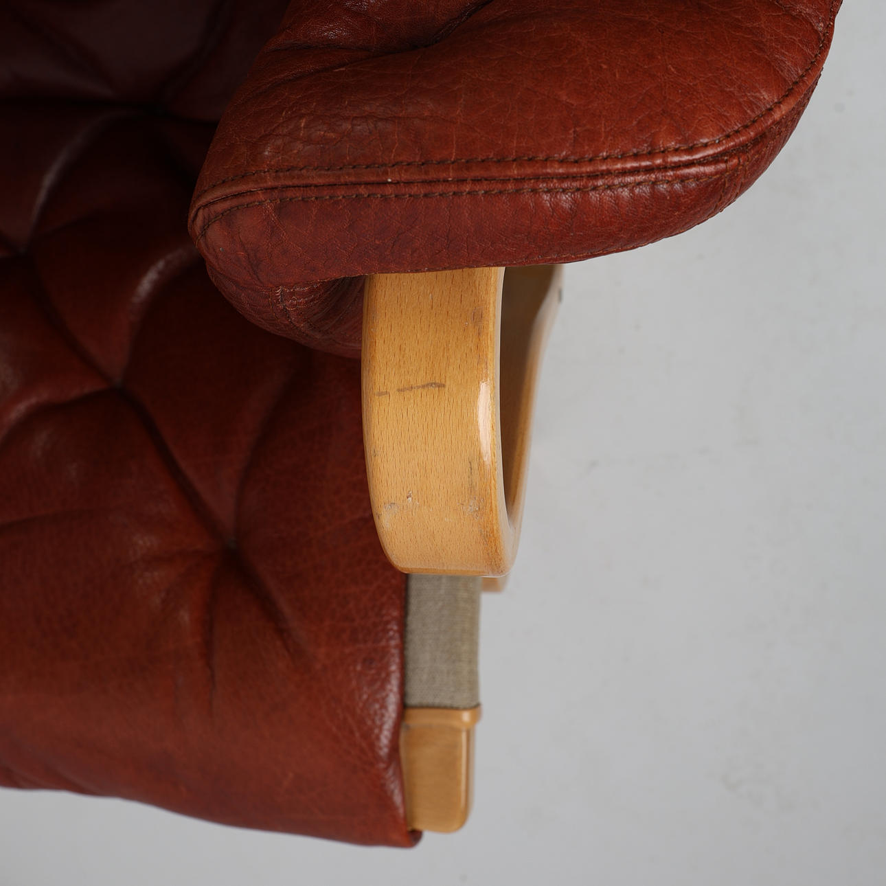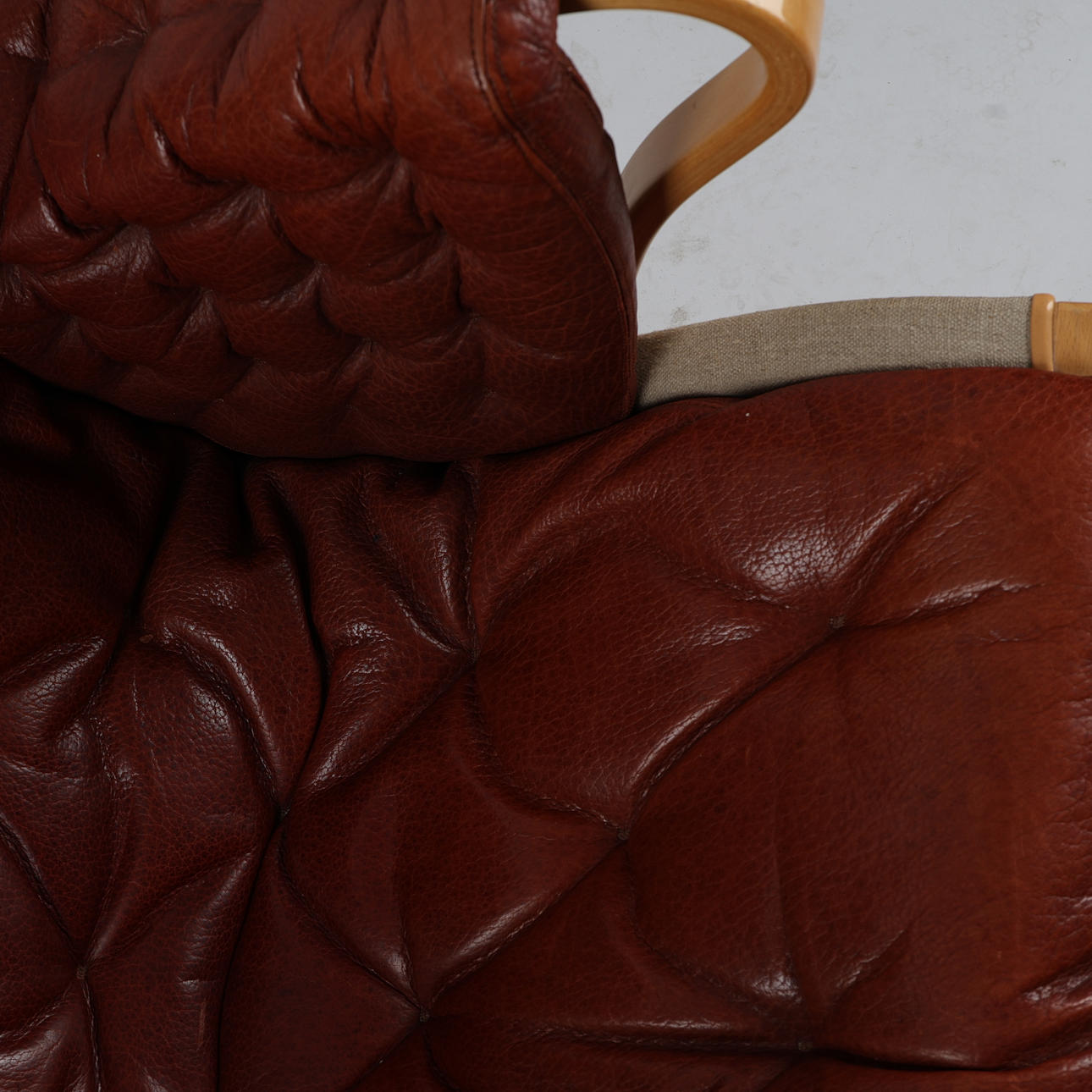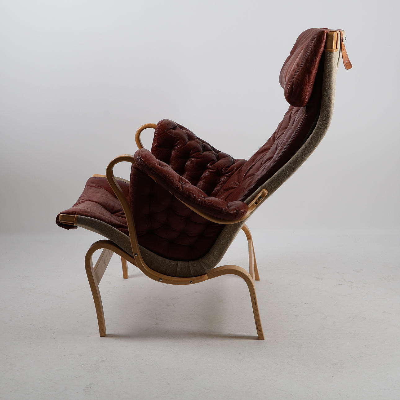 4391240. BRUNO MATHSSON. Sessel, Buche „Pernilla“, Leinwand, Leder, DUX.