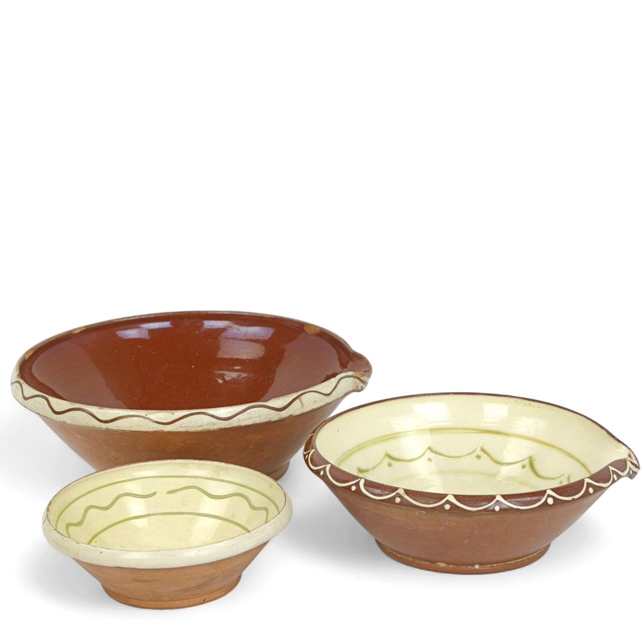 ABFALLSCHAUM. Eine Schüssel und eine Eierkuchenform, 2 + 1 + 4 Stück, Keramik, 1900er Jahre.