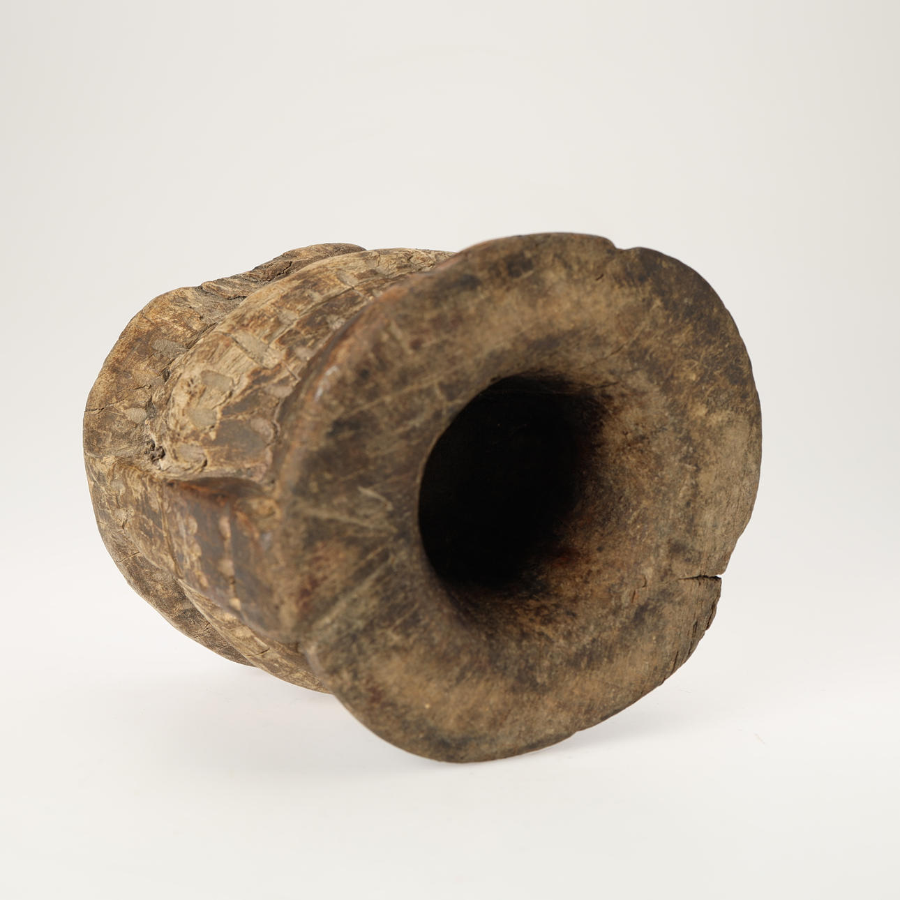 Afghanischer Mörser aus massivem geschnitztem Holz, wahrscheinlich Nuristan 17-1800, Stößel/Stempel nicht enthalten. H. 14,5 cm, Ø 14-16 cm.