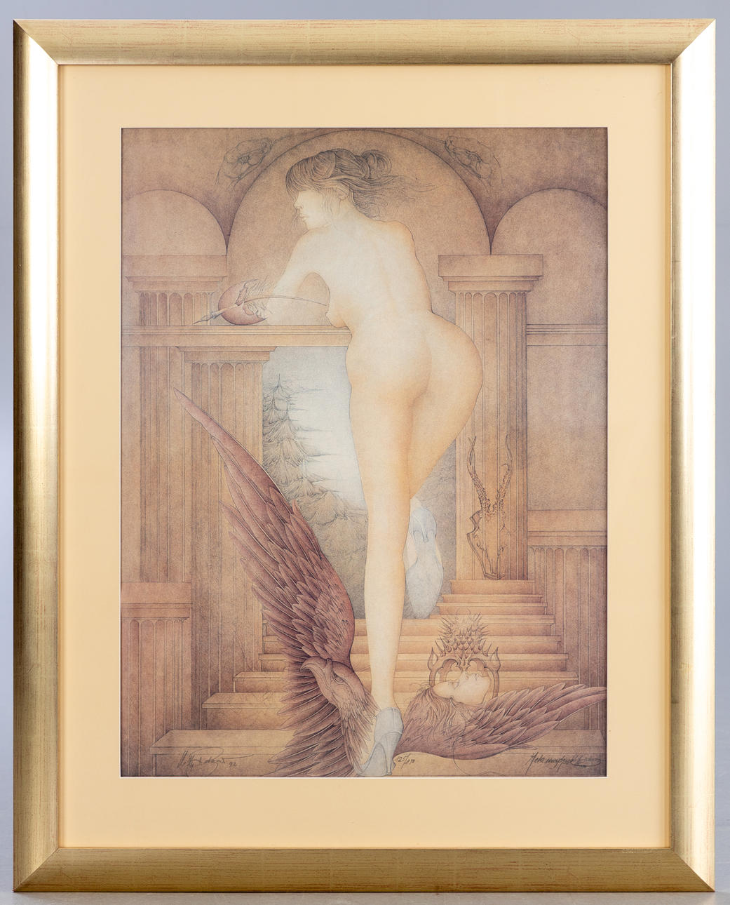 Wolfgang Fratzscher (1944-2009), Metamorphose, Lithographie, handkoloriert, 1992, signiert, datiert, nummeriert, betitelt und bezeichnet, Exemplar 125/150, ca. 79 x 59 cm, hinter Passepartout und Glas gerahmt, mit Rahmen ca. 105 x 85 cm.