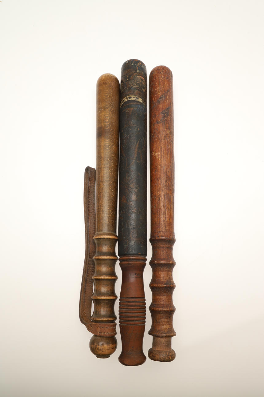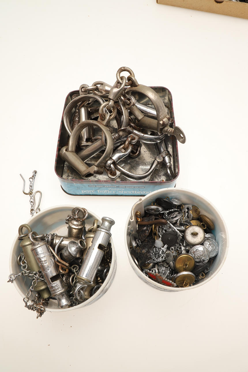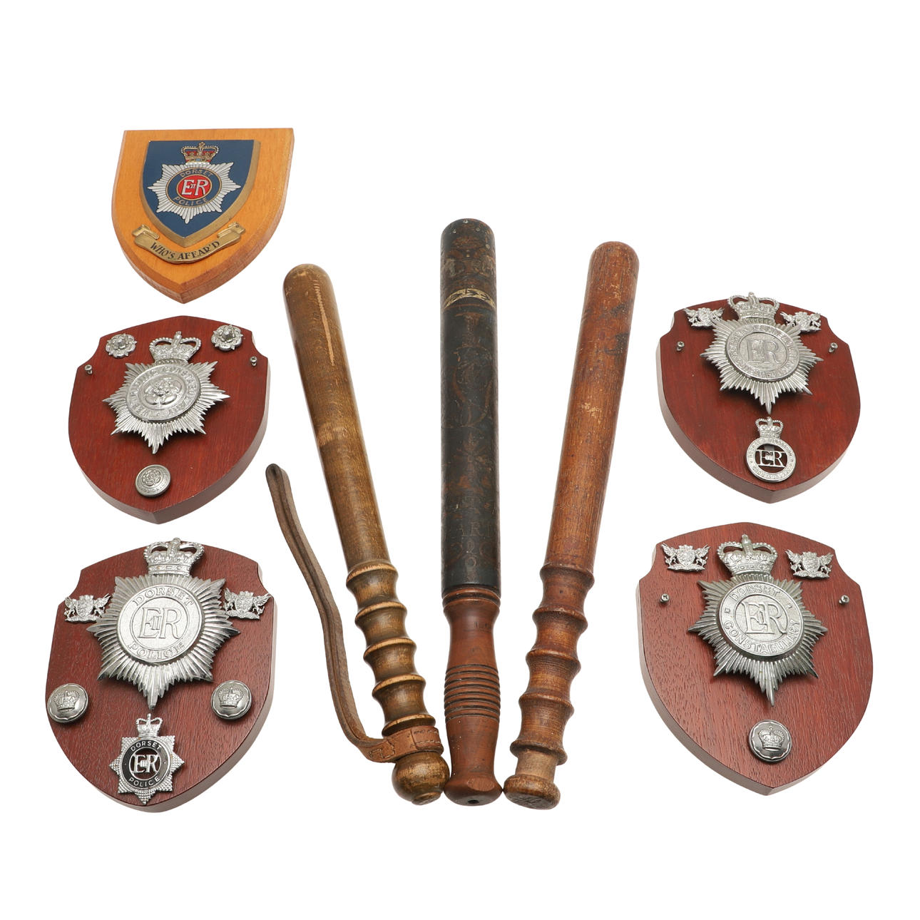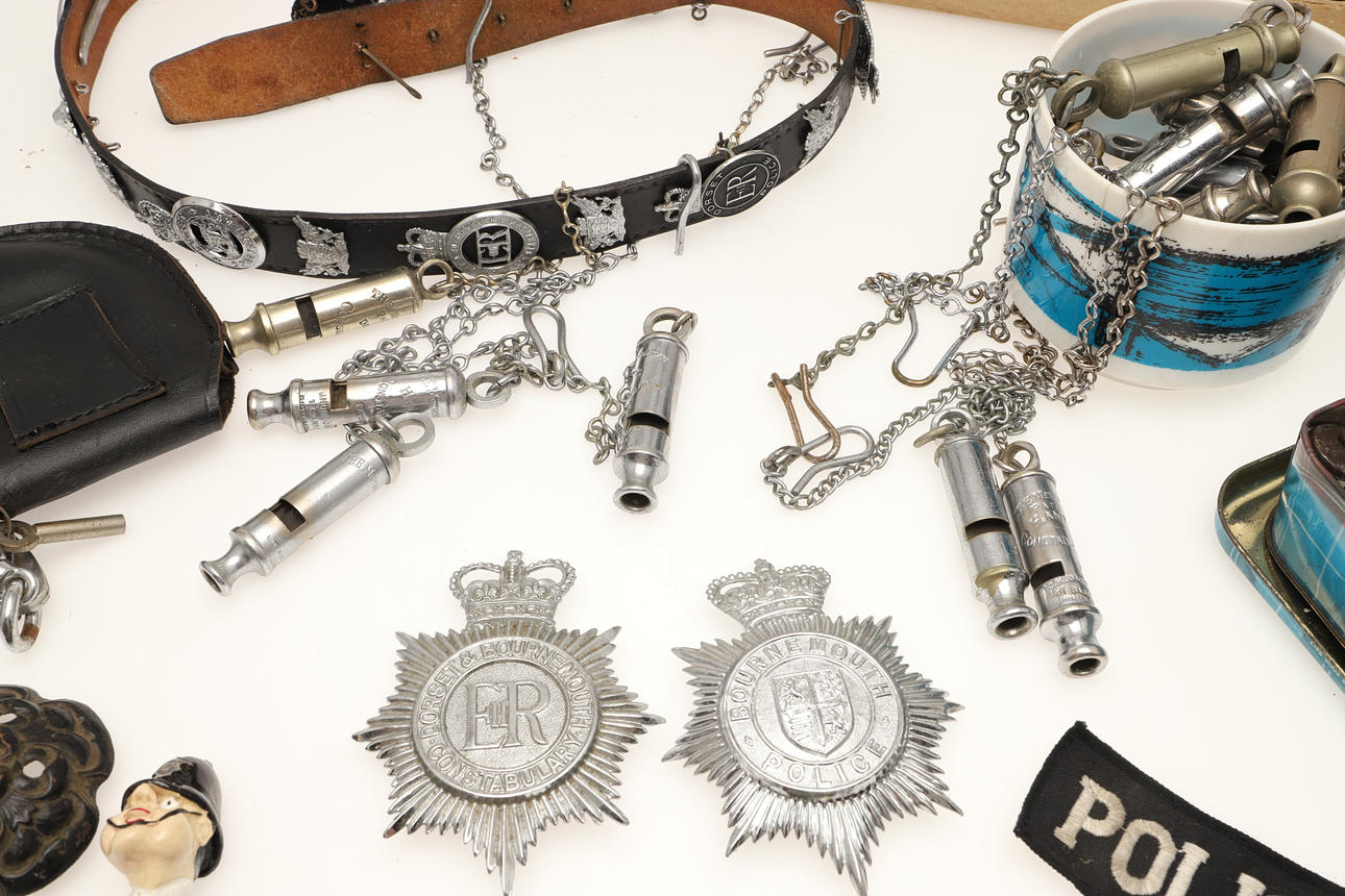 bestehend aus einem viktorianisch bemalten Holzschlagstock, zwei weiteren (unbemalten) Handschellen, veralteten Abzeichen, „Metropolitan“ -Pfeifen, darunter für Hants, Dorset Constabulary, größtenteils unbenannt, (vier von Hudson & Co und Dowler & Sons) usw.