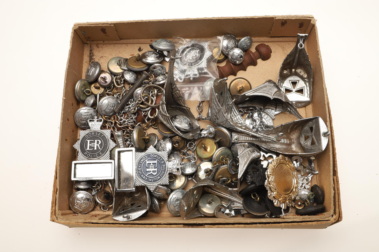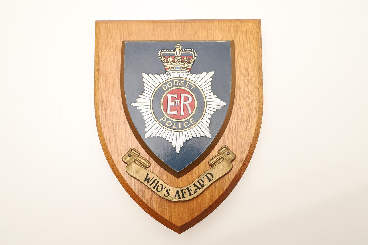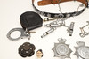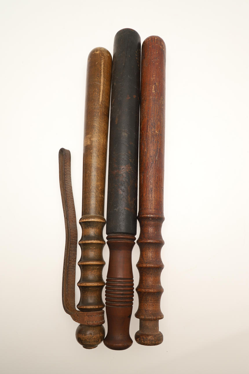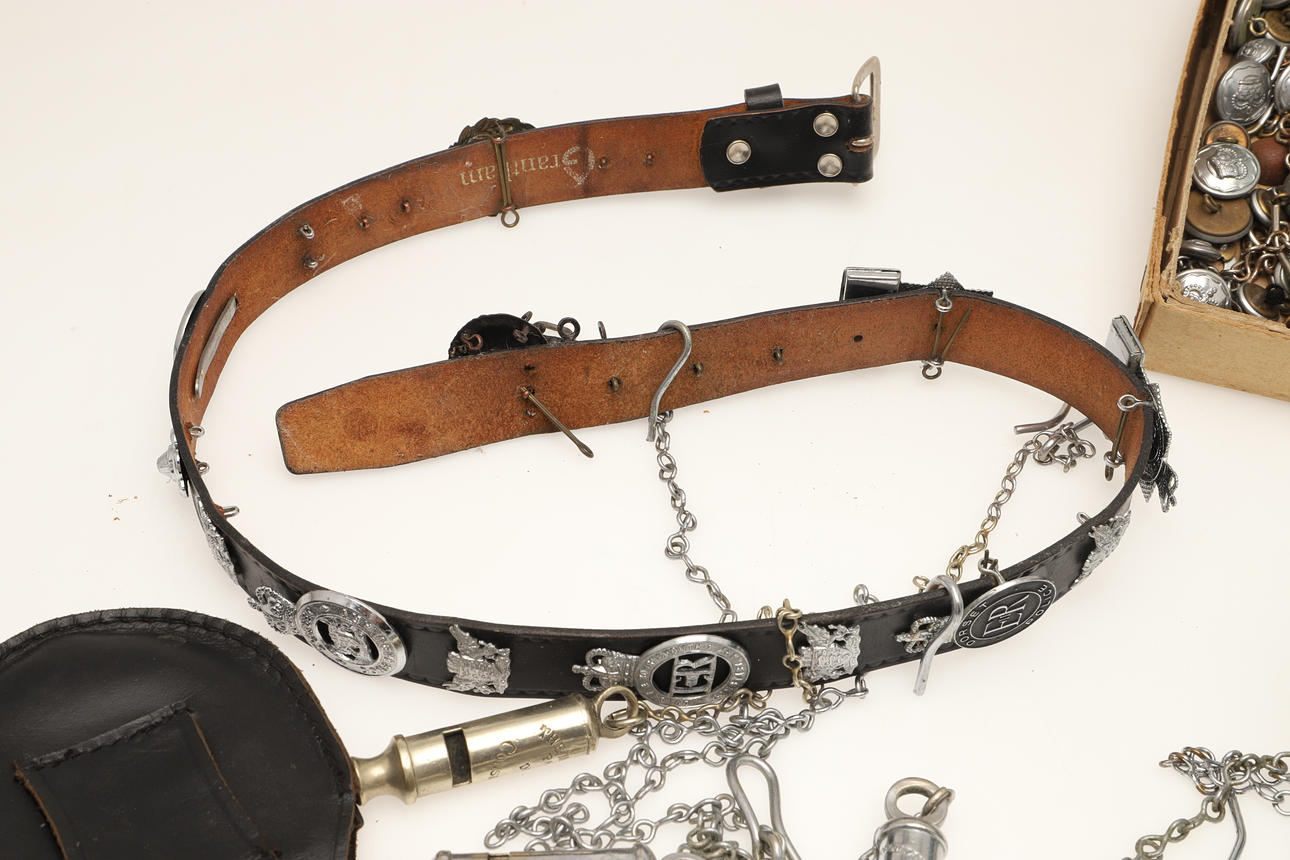 bestehend aus einem viktorianisch bemalten Holzschlagstock, zwei weiteren (unbemalten) Handschellen, veralteten Abzeichen, „Metropolitan“ -Pfeifen, darunter für Hants, Dorset Constabulary, größtenteils unbenannt, (vier von Hudson & Co und Dowler & Sons) usw.
