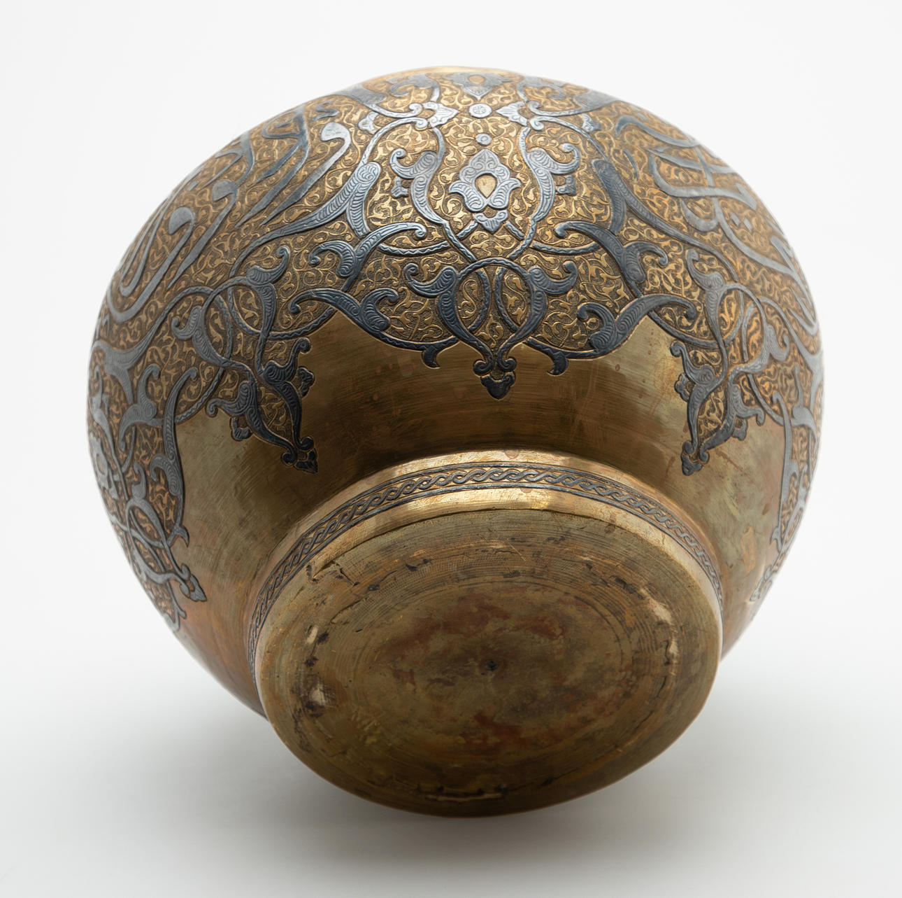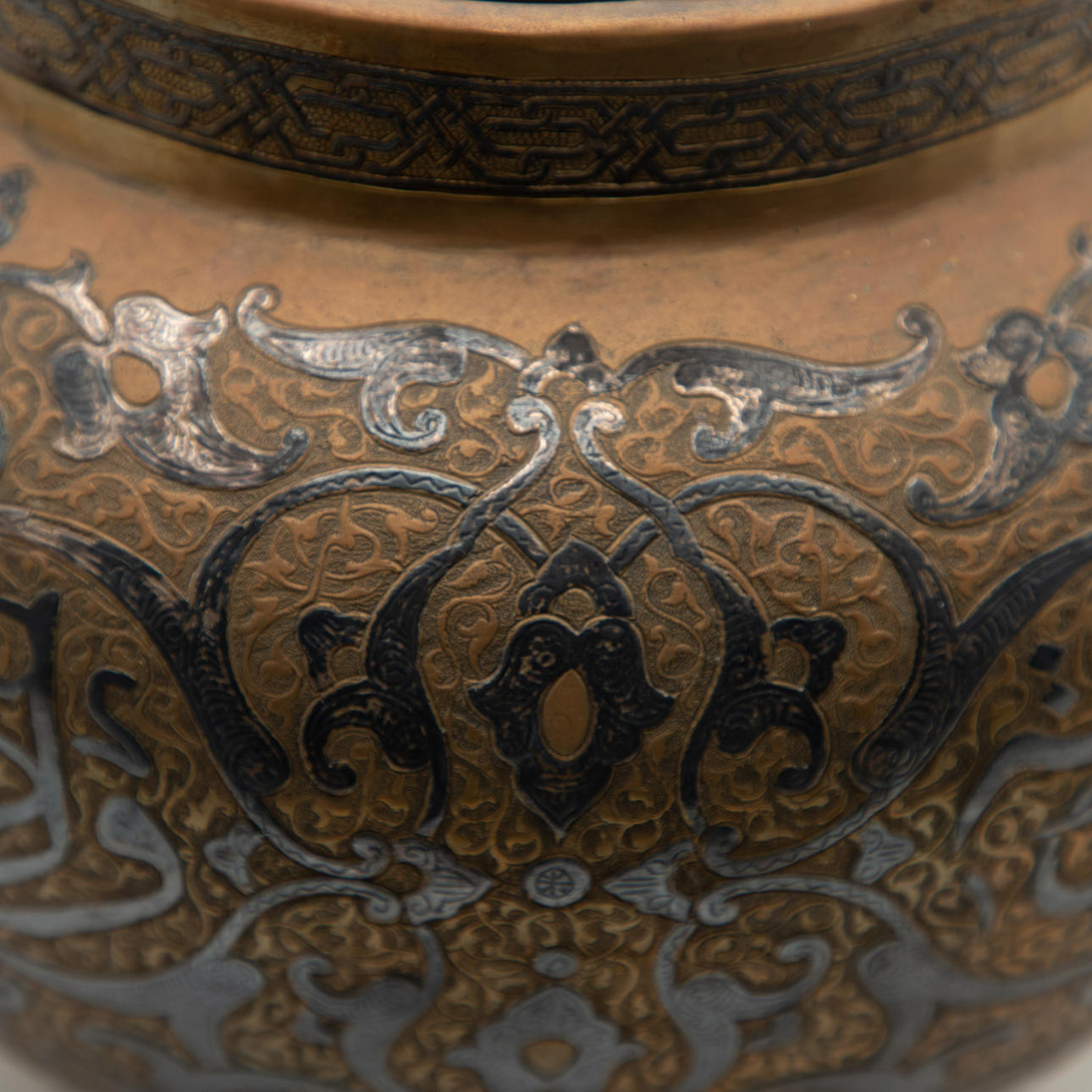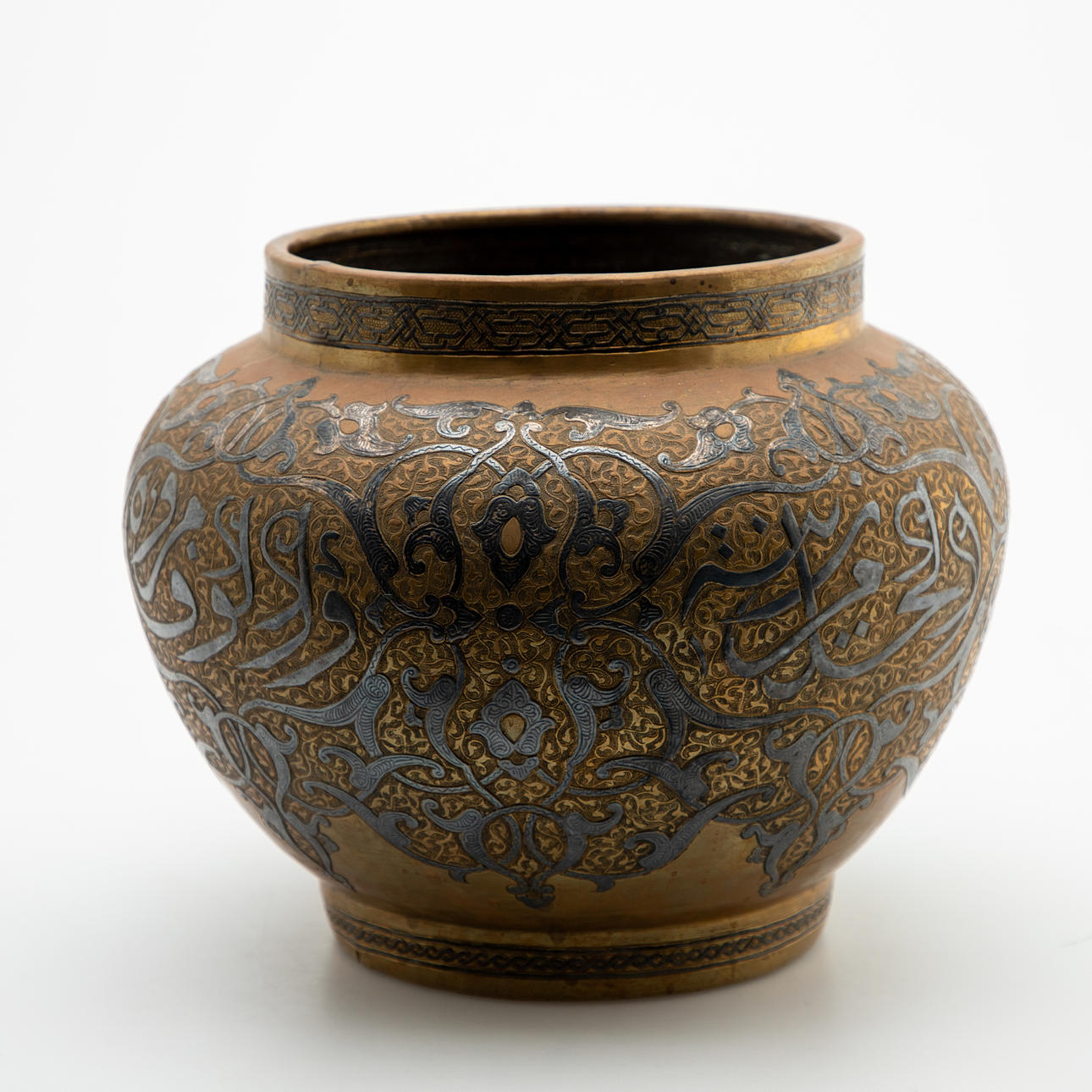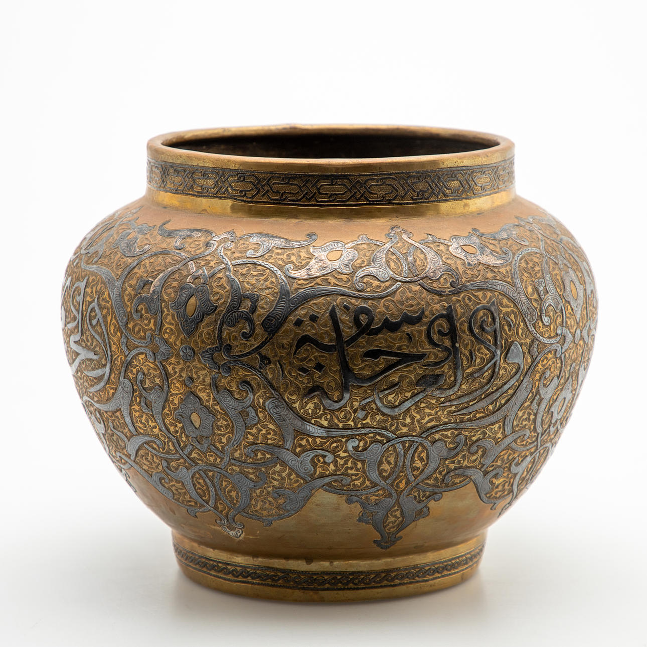 Messing mit eingelegtem Silber, getrieben und graviert. Reich verziert mit arabischen Inschriften und Ranken.