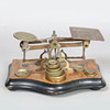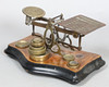 Auf einem nussbaumfarbenem und ebonisiertem Sockel mit Duttfüßen, mit Versandkosten auf einer Pfanne, zusammen mit neun Gewichten, 10 cm x 19,5 cm x 12 cm.