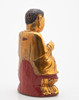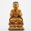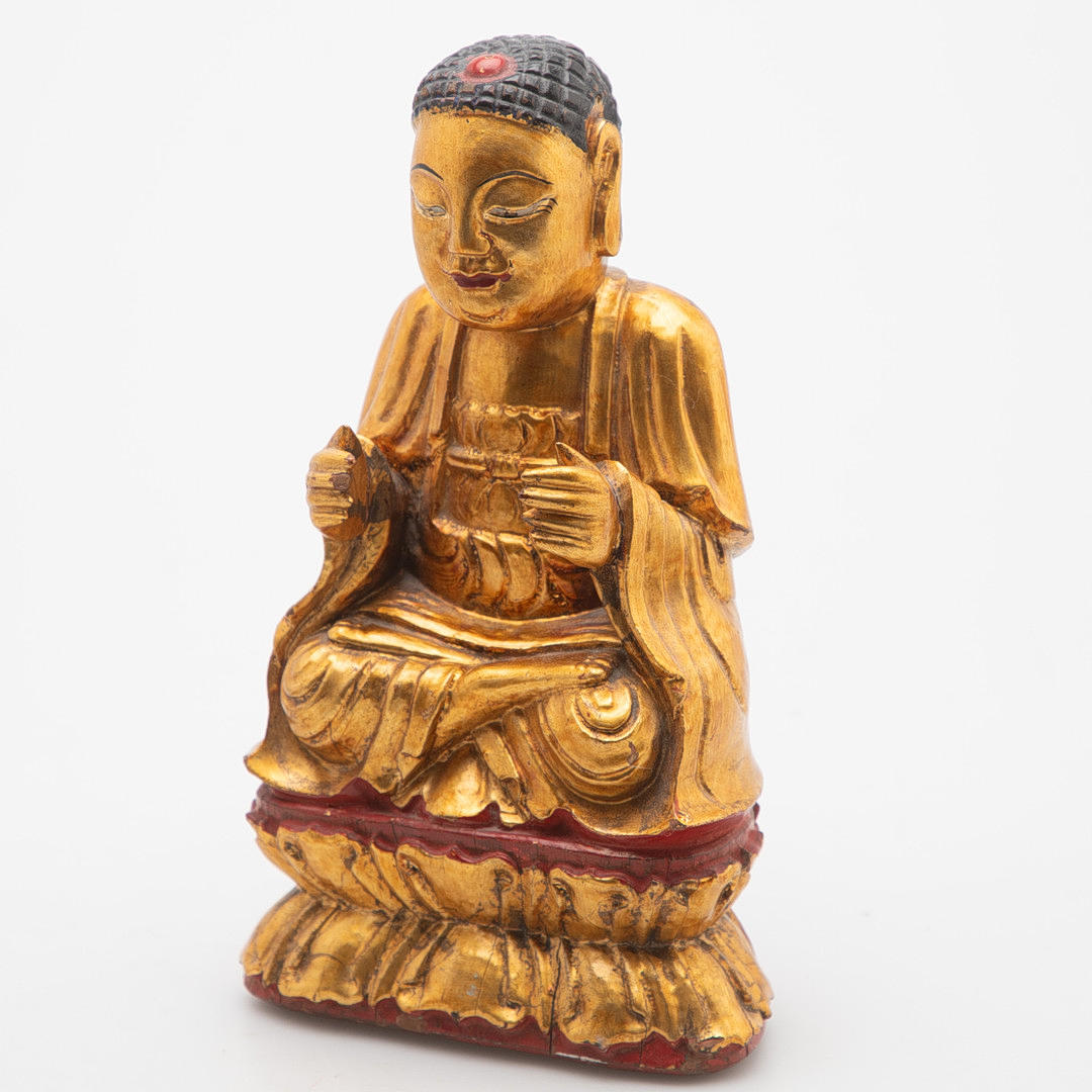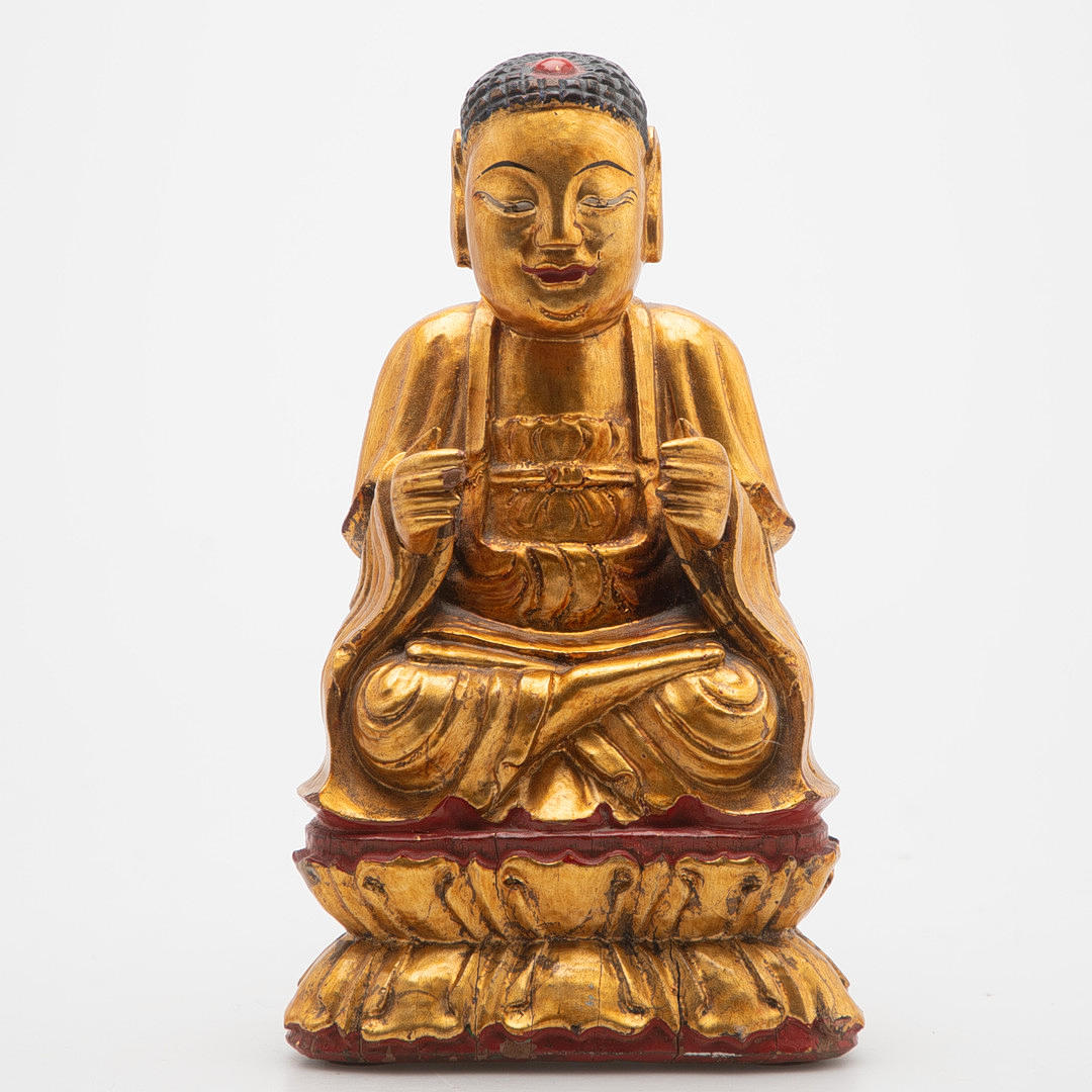 Holz, halbrund geschnitten, schwarz und rot gefasst, vergoldet. Im Meditationssitz auf einem Doppellotussockel.