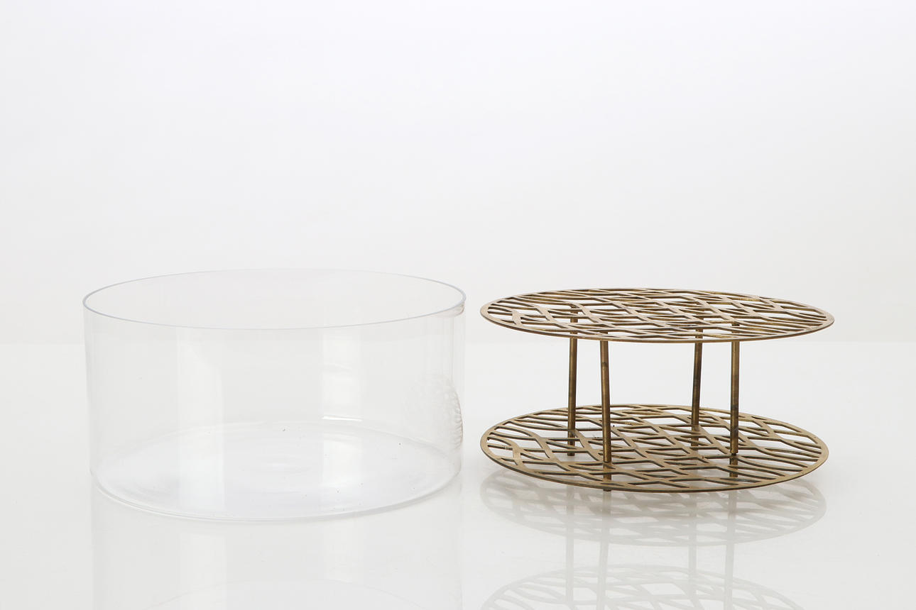LANGE VASE „WIESE“. Klarglas mit Blumenhalter aus Messing.