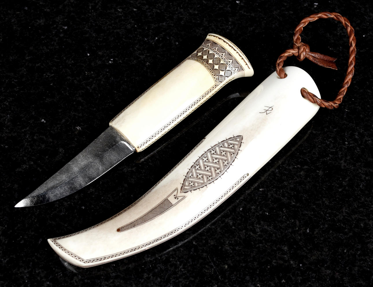 Hergestellt aus reich graviertem Rentierhorn in stilisiertem Dekor.