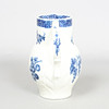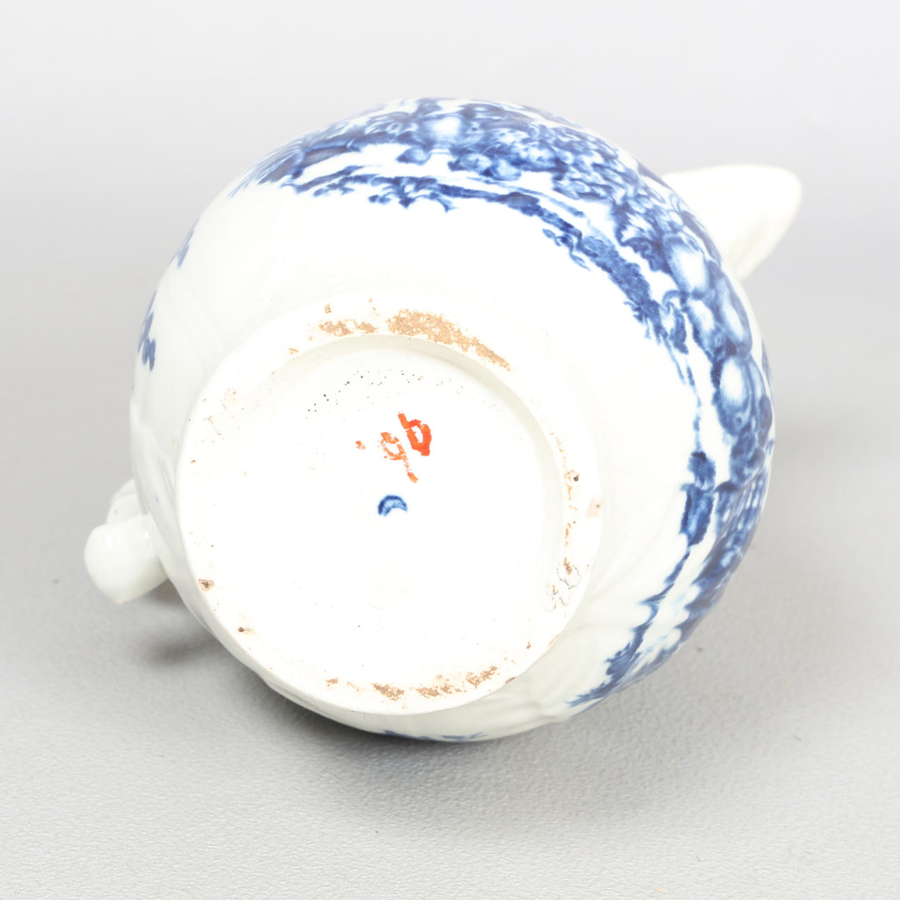 von abgerundeter, eiförmiger Form mit geformtem, überlappendem Kohlblattdekor, blau bedruckt mit dem Muster „Parrot Pecking Fruit“, wobei der Hauptdruck von Fruchtsprays flankiert wird, darunter ein zylindrischer Hals mit bärtigem Maskenauslauf, doppelter „C“ -Henkel und breiter sechseckiger Rautenrand, blaue Halbmondmarkierung an der Basis und rot nummeriert 96, 15,5 cm hoch.