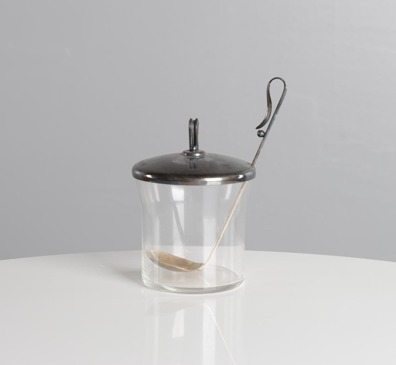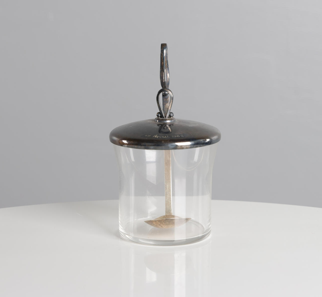 4401906. E. DRAGSTED. Marmeladenglas mit Deckel und Löffel aus Sterlingsilber. Beide gestempelt, E. Dragsted, Sterling, Dänemark. (2.)
