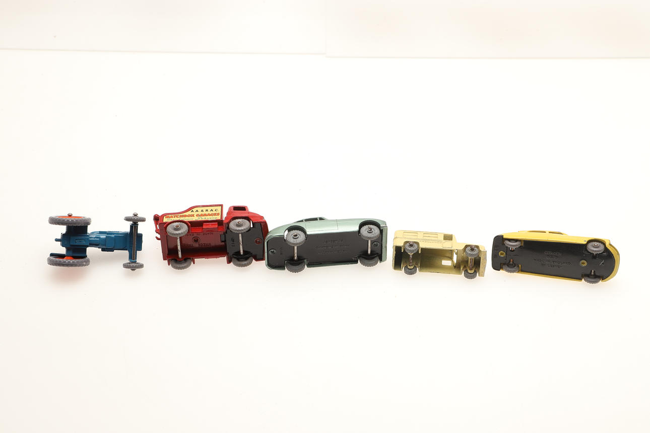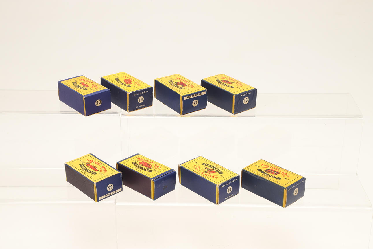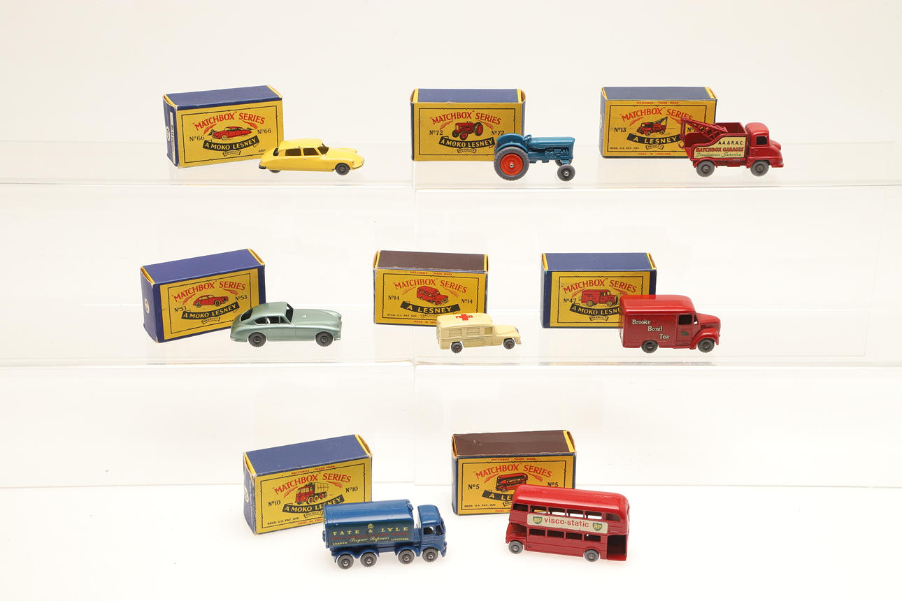 8 Boxmodelle, darunter Citreon Nr. 66 DS19, Fordson Tractor Nr. 72 (orange Hinterradnaben), Nr. 47 Brooke Bond Tea Trojan Van, Nr. 5 Routemaster Bus, Nr. 10 Tate & Lyle Foden Sugar Container, Nr. 14 Lomas Ambulance, Nr. 53 Aston Martin und Nr. 13 Wreck Truck. Boxen 7 cm x 4 cm. (8).