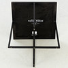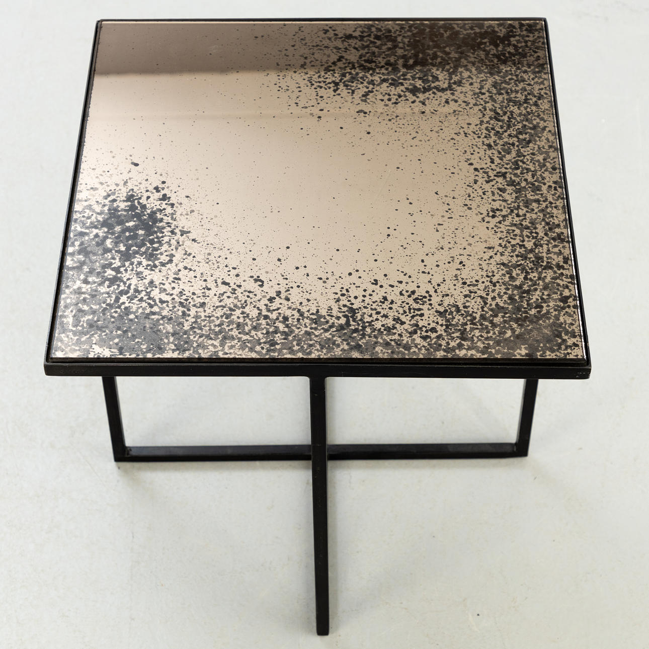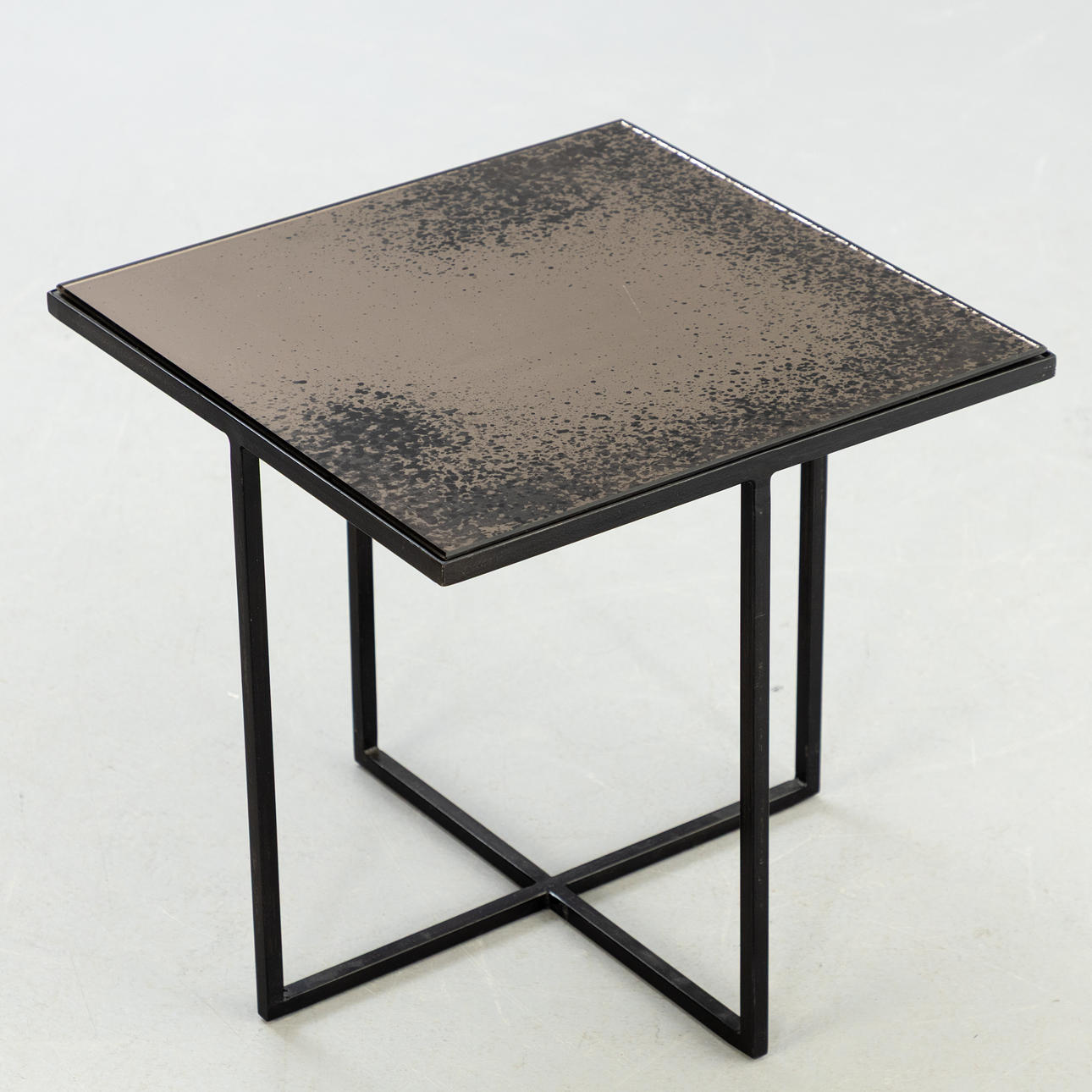 Quadratischer beistelltisch. Rahmenkonstruktion aus Metall, einliegende Glasplatte.