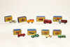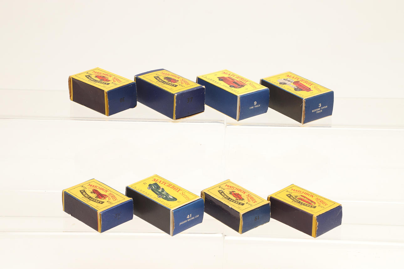 8 Boxmodelle, darunter Karrier Bantam Lorry Nr. 37 (Coca Cola), Ford Prefect Nr. 30, ERF Truck Nr. 20, Jaguar D Type Nr. 41 (Nr. 41), MG Midget Nr. 19, Bedford Tipper Nr. 3, Bedford Coach Nr. 21 und Fire Truck Nr. 9 (Marquis). Größte Box 7 cm x 4 cm. (8).